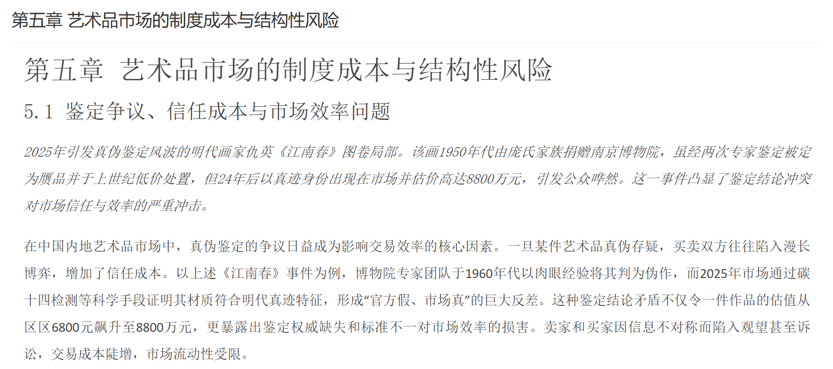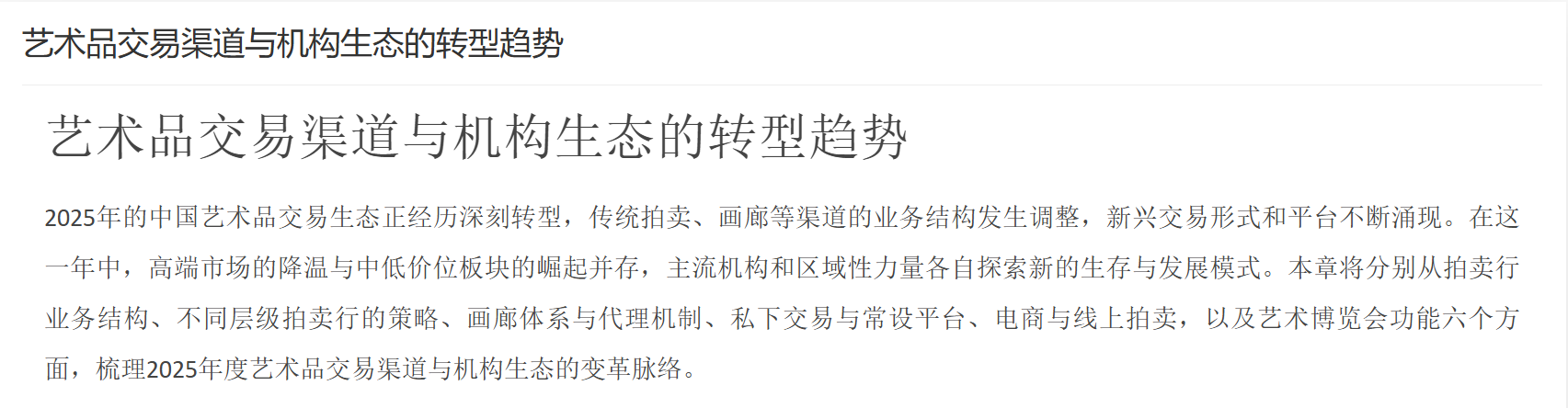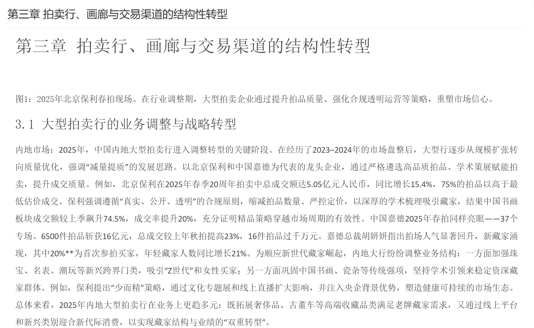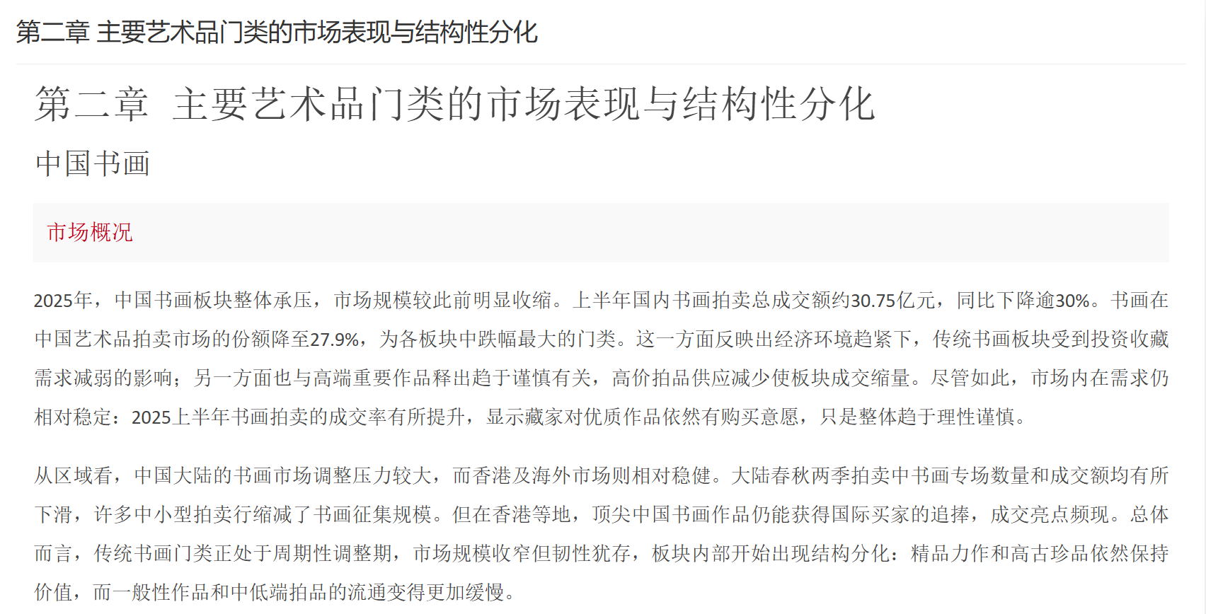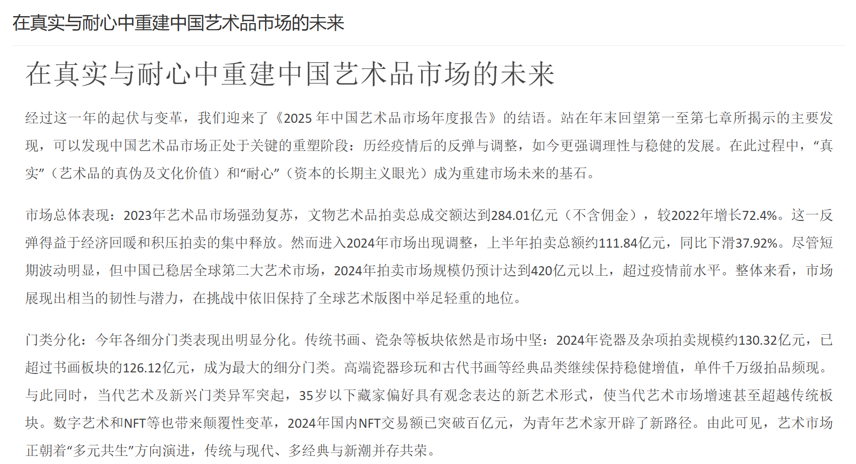 市场挑战与趋势:尽管规模庞大且增长迅速,大陆艺术品市场依然面临不少挑战。首先是市场规范与诚信问题,例如拍卖“流拍率”及“结算率”偏低一直为业内诟病——2022年内地拍卖成交款项截止2023年5月仅有54%完成结算,为近年最好水平却仍不足六成。高价拍品的全额结算比例也仅提升至41%,表明买家违约现象尚未杜绝。其次,鉴定评估体系有待完善,赝品、估价不准等时有发生,市场诚信体系建设需加强。再次,监管与服务配套仍待提升,比如艺术金融、法律仲裁、保险物流等专业服务相对欠成熟。对此,政府也在加大力度引导:通过修订法律、建立“一物一码”可追溯系统和联合鉴定中心等手段,加强对艺术品交易的监管与支持。未来,大陆市场被寄望在**“规范中创新”**:既要加强法治保障市场健康发展,又要通过自贸区、数字化交易等创新提高效率和开放度。随着经济环境变化和藏家需求演变,大陆市场格局可能出现新的转型,例如年轻藏家对当代艺术和数字艺术的兴趣上升、新兴艺术品门类崛起等。总体而言,中国大陆艺术品市场基础雄厚、潜力巨大,在政策调整和行业自律的双重作用下,有望在全球舞台上发挥愈发重要的作用。