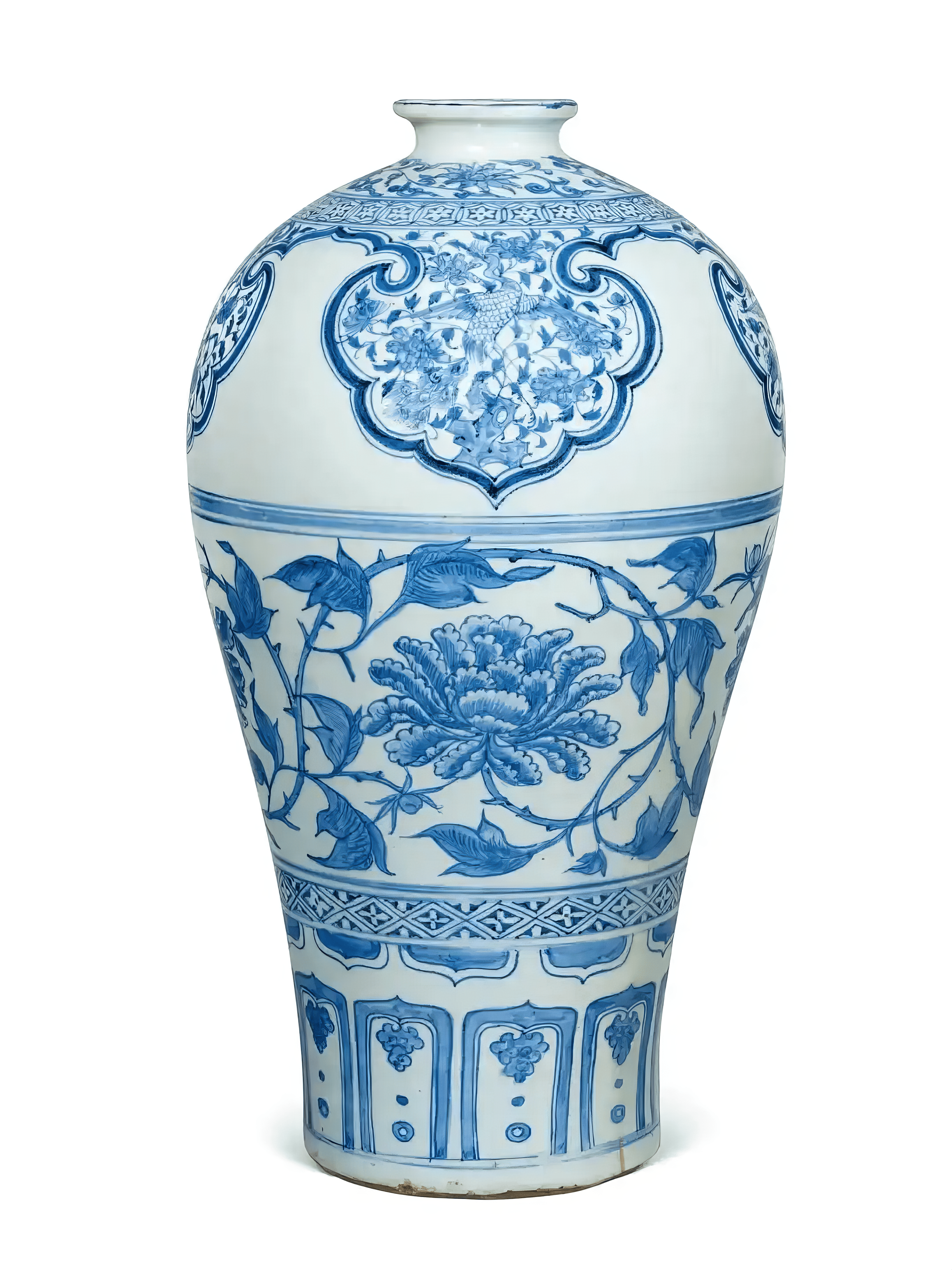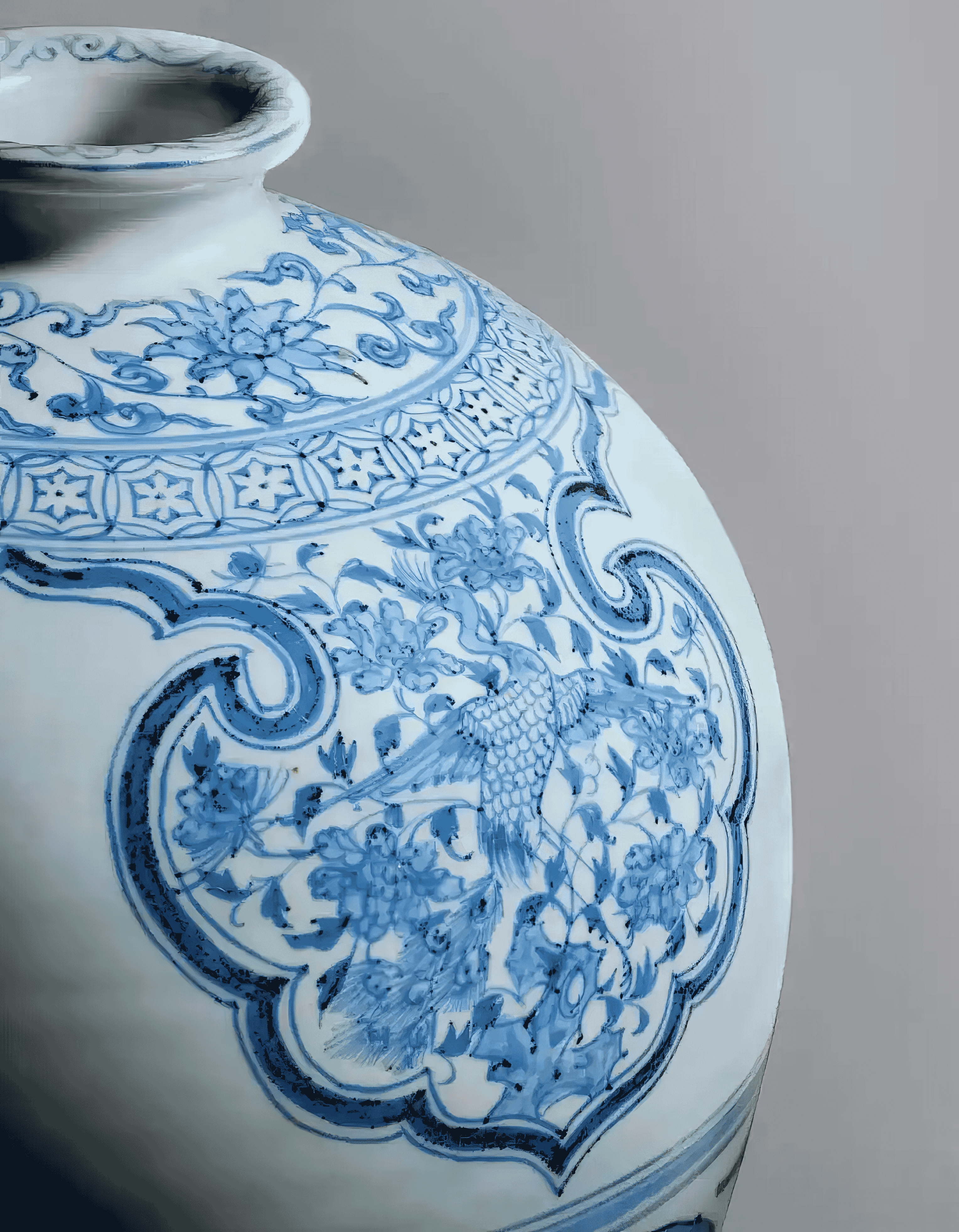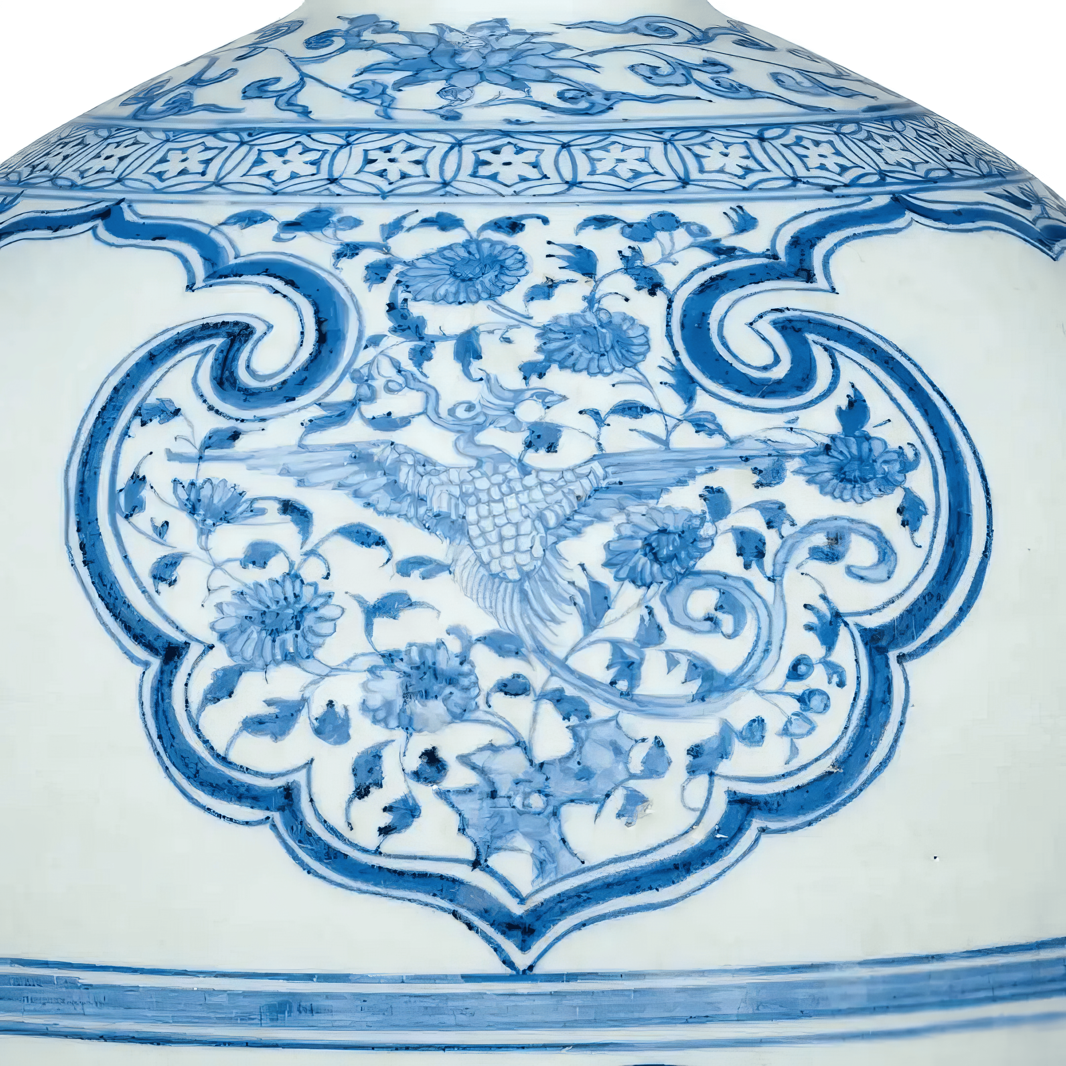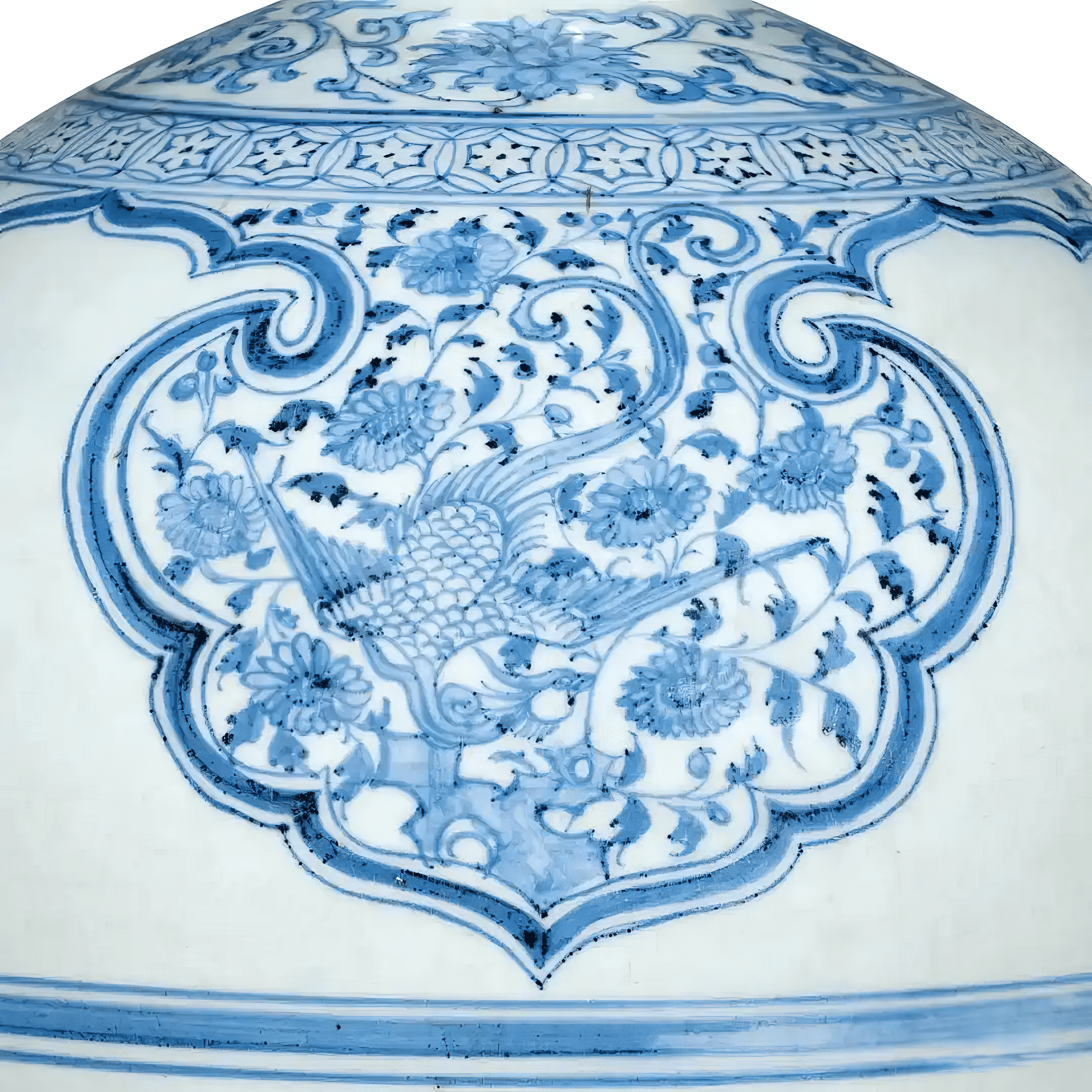 青花梅瓶于云肩内饰凤凰孔雀纹属少见。伊朗德黑兰国家博物馆藏有一例(阿德比尔神庙旧藏),唯因出版角度受限,仅见凤穿牡丹,未见孔雀;若按布局与腹部纹饰对比,纽约大都会艺术博物馆(The Met)、日本出光美术馆及罗桂祥旧藏中,皆有腹绘缠枝牡丹、肩饰大雁穿花之近例。