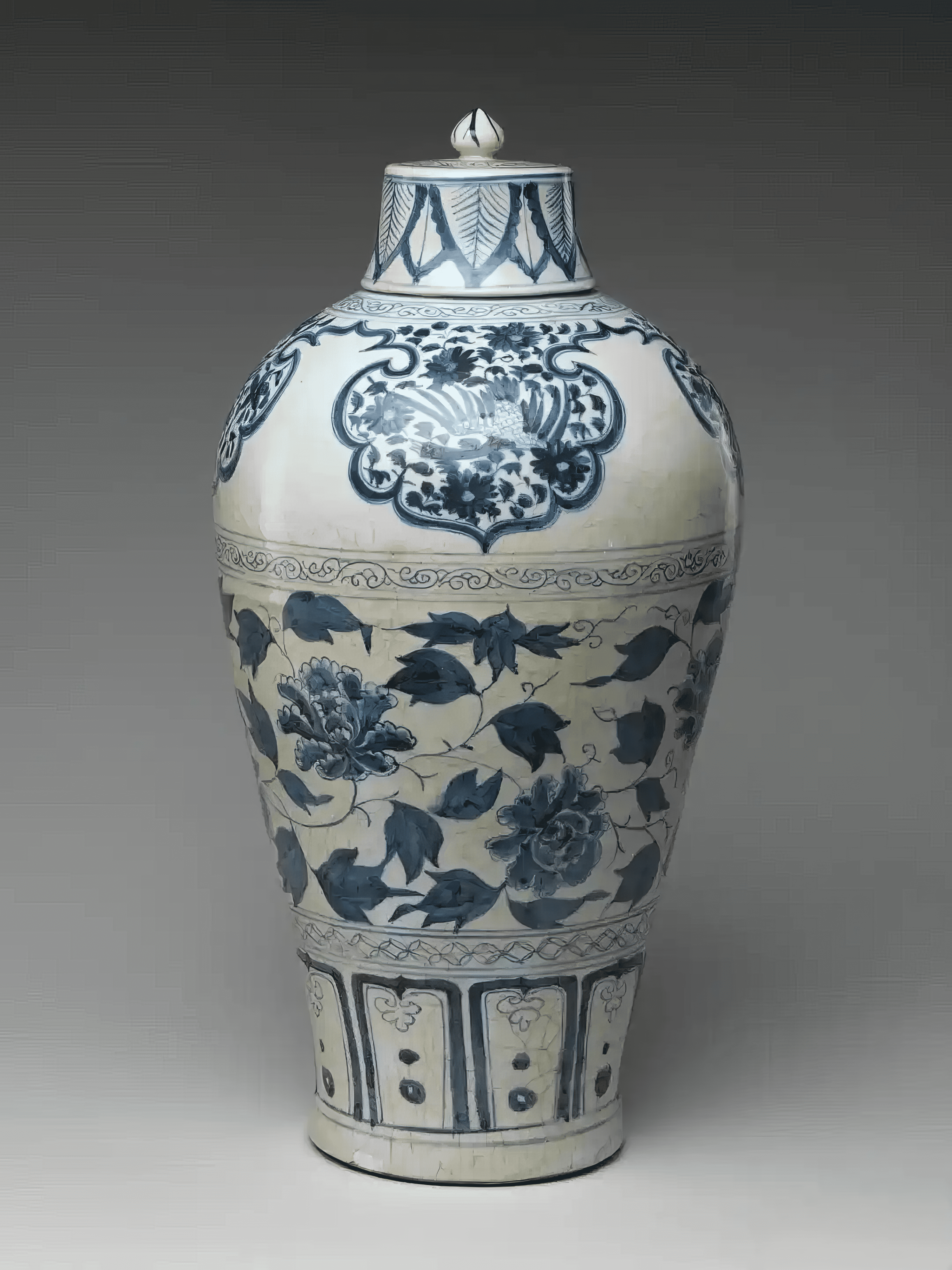元朝政府对瓷器管制严谨,设「浮梁磁局」掌理烧造。此类青花瓷绝非寻常百姓能拥有,多供官府督府、王亲贵族使用,或作为贸易与馈赠输往中东。大件如梅瓶、玉壶春瓶、扁壶等,常为贡品或外销之用,造型与纹饰蕴含浓厚的伊斯兰装饰风格。