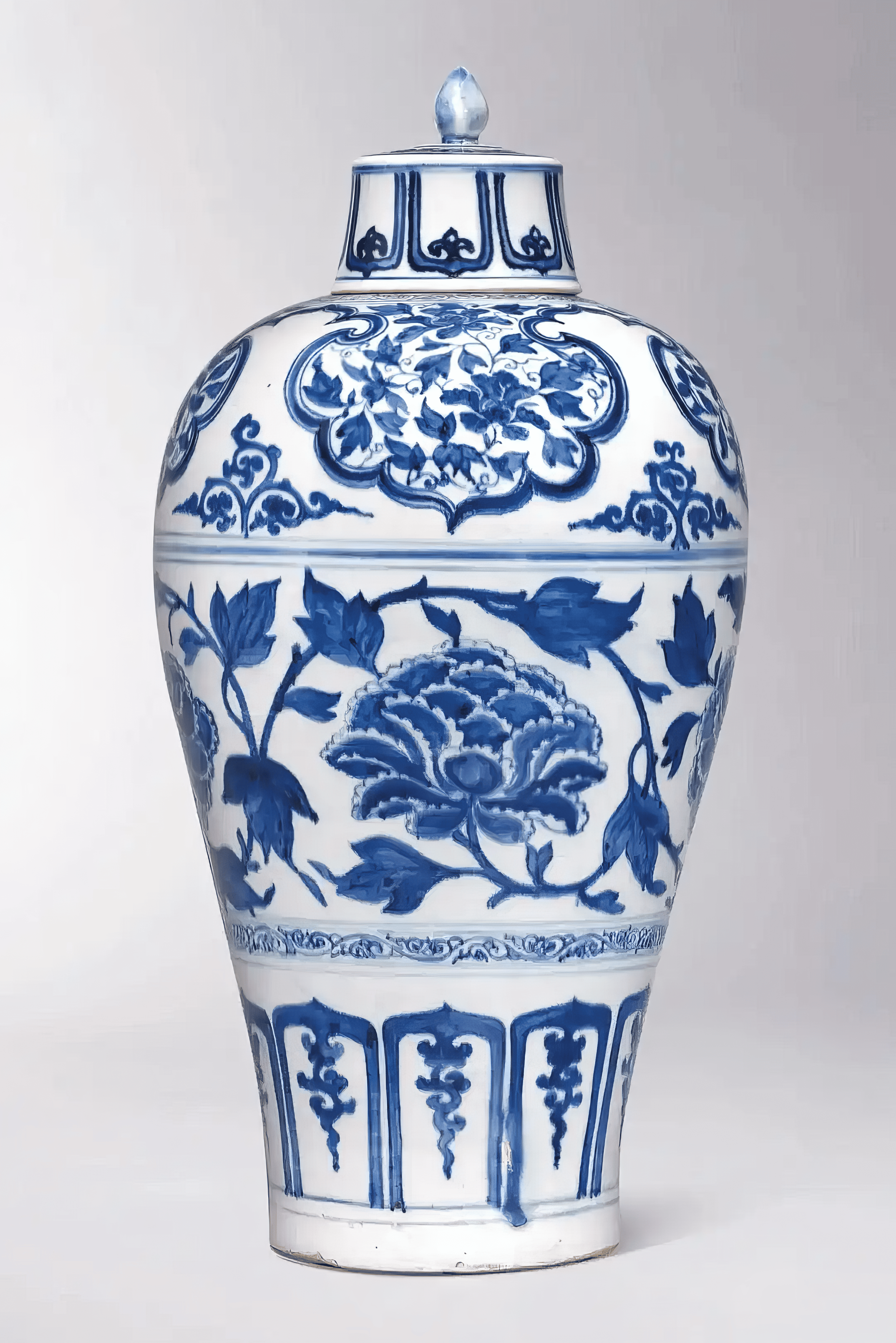 元 青花缠枝牡丹云肩纹带盖梅瓶