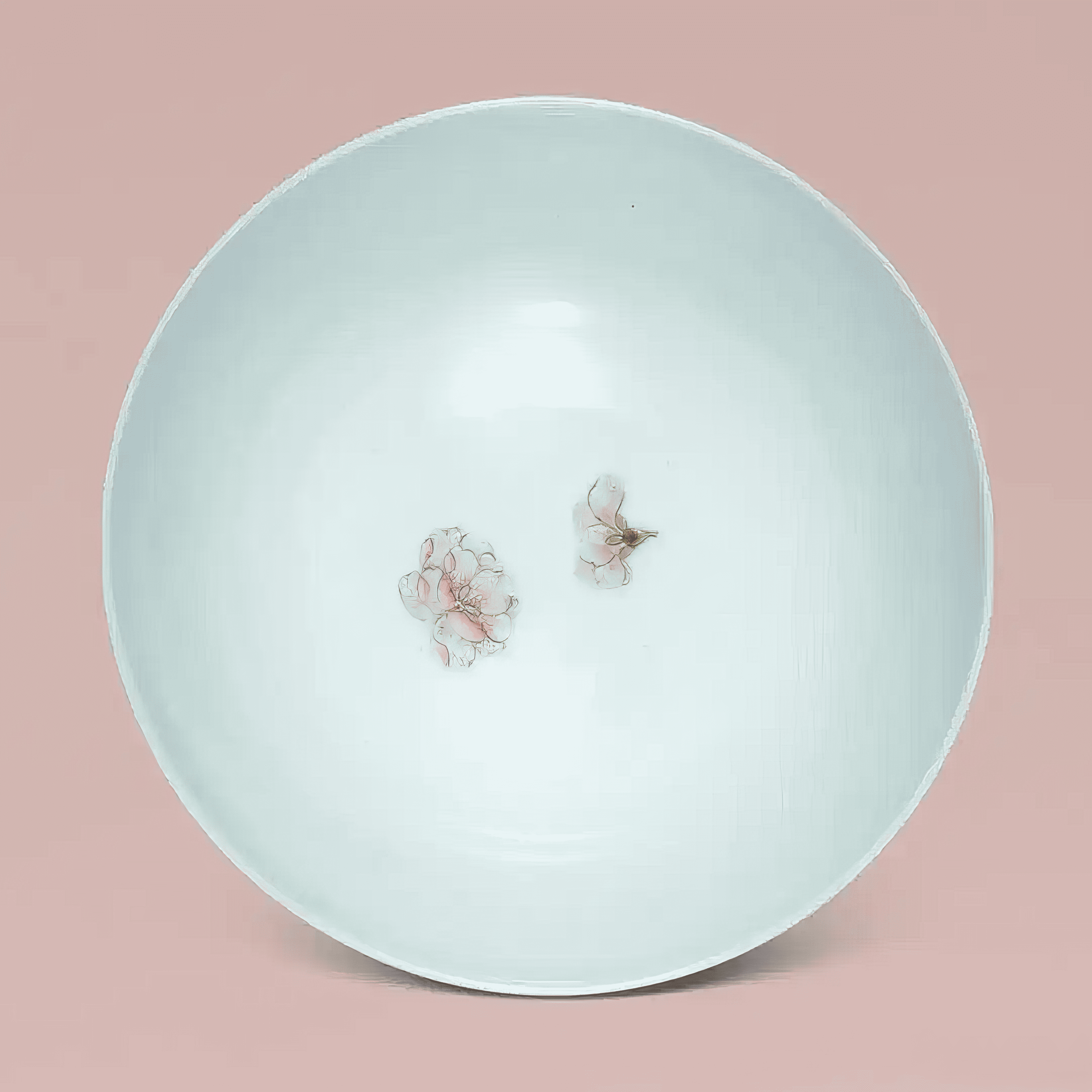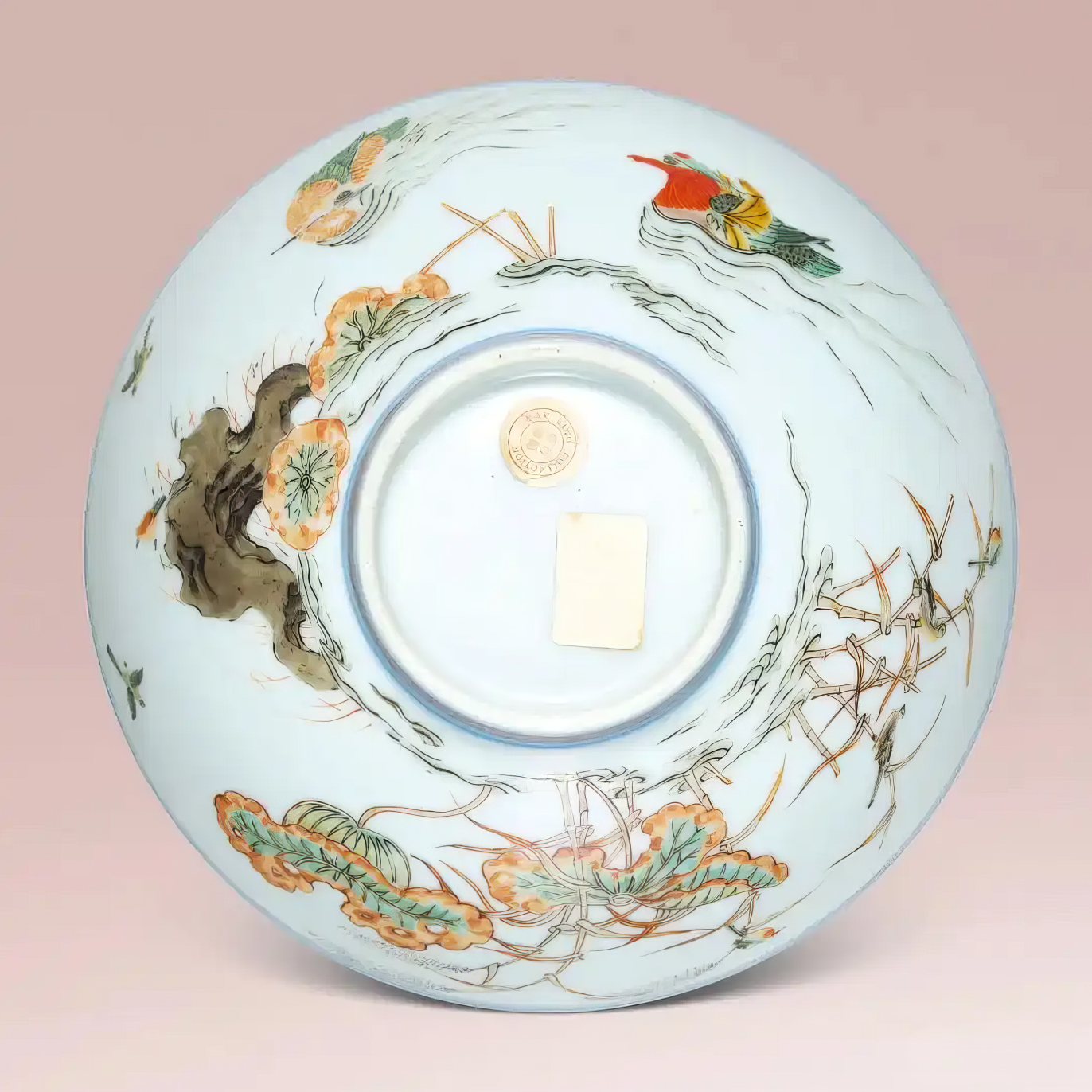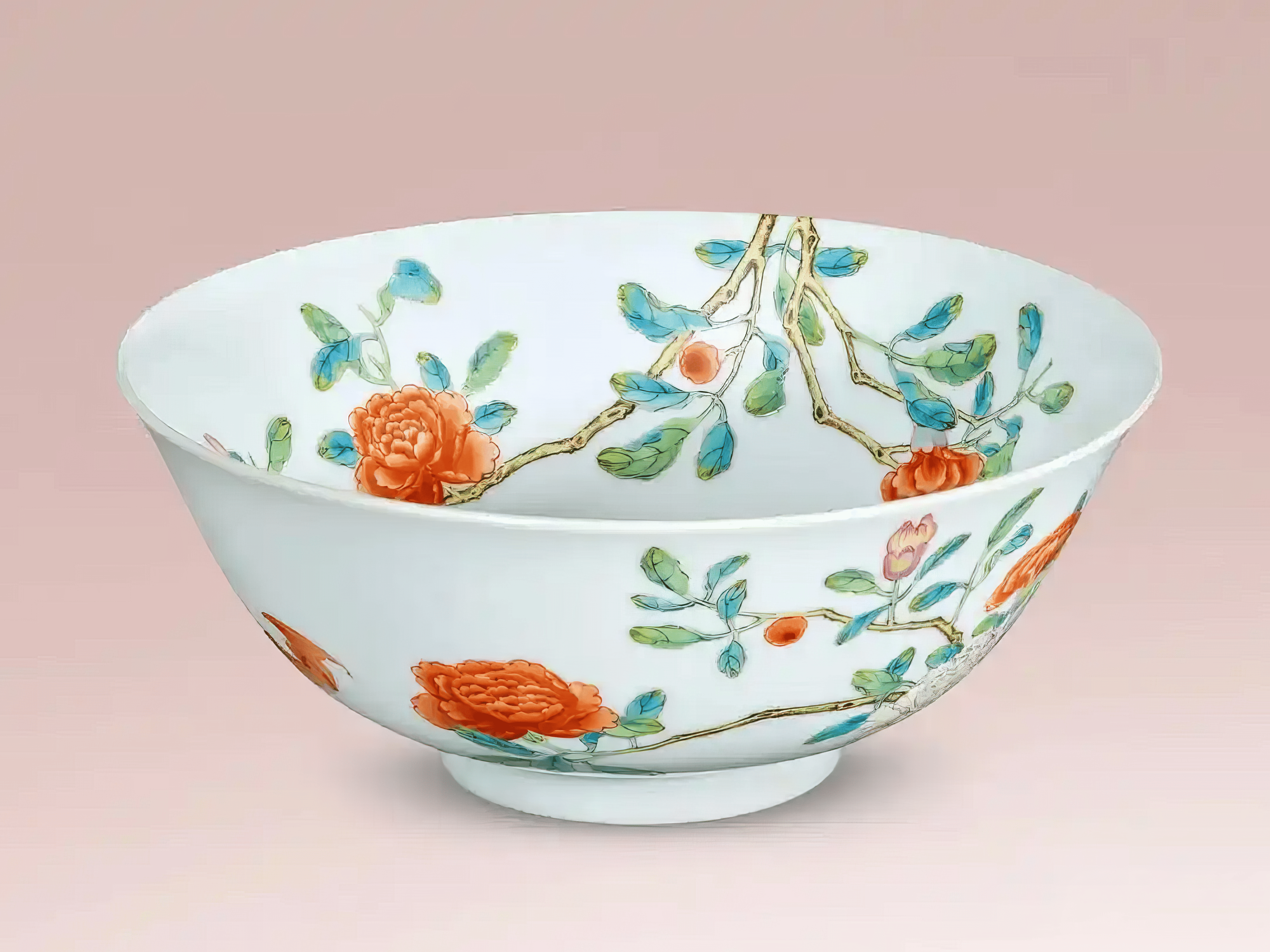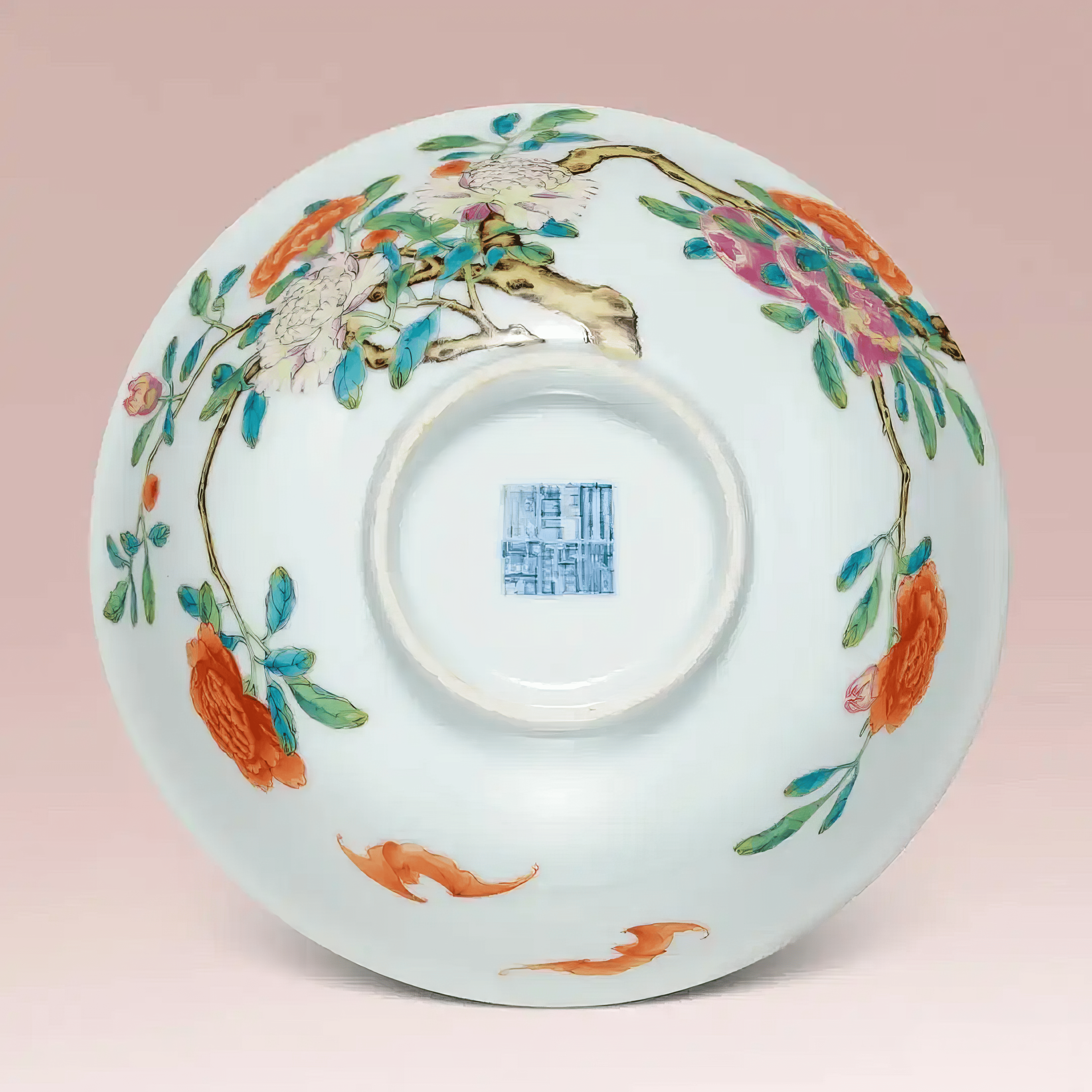 牡丹素有花中之王美誉,象征富贵吉祥;石榴最早来自西域,具多籽特性,外表鲜红具喜气,民间以其纹样喻「多子」、「榴开百子」,取子孙繁多之吉祥寓意。器身留白处点缀的五只红蝠(外壁两只,内壁三只),则取「鸿福」与「五福」之意。