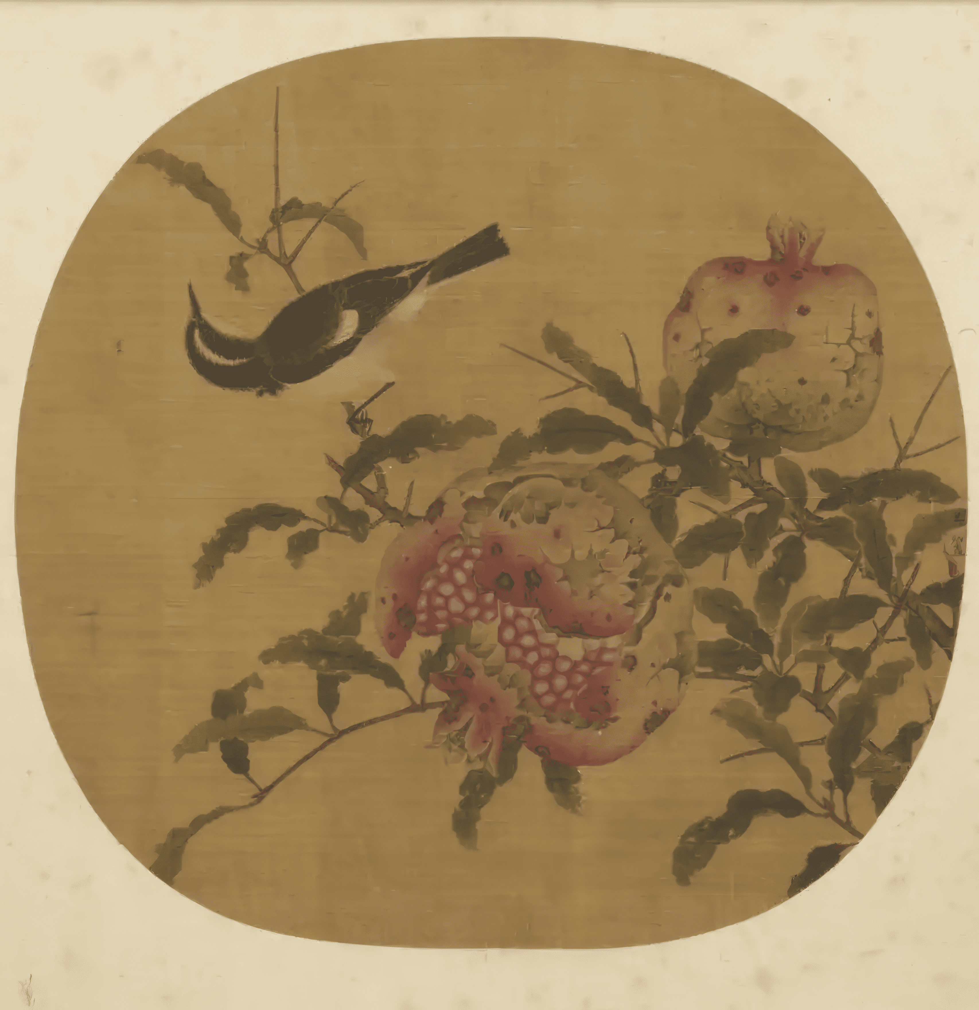 两束石榴花枝自外壁蜿蜒而入,画师以胭脂紫料彩点染果皮,呈现粉红至淡绿的渐层过渡;果壳裂口处露出的籽实,彩料施用厚实,表面带有油质感。比对台北故宫藏南宋吴炳《榴开见子图》,可知此类画法在内府有固定的画样范本。
