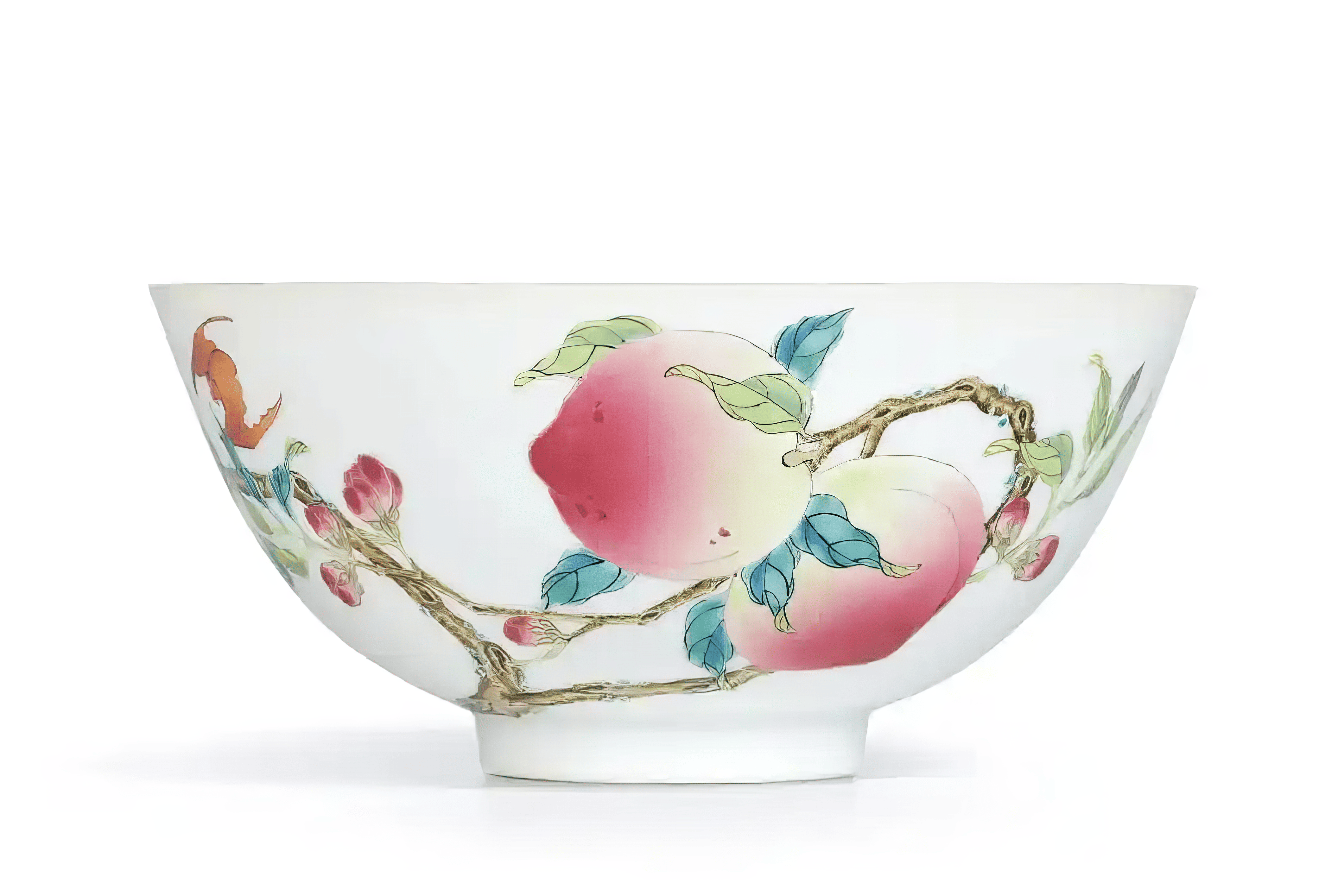 雍正、乾隆时期流行过花卉、花果、龙纹等;至道光、光绪时期过枝葡萄、癞瓜纹最为常见。过枝纹饰多见于平展开阔的瓷盘;本品为瓷碗,器形收敛、空间局促,画师需在陡峭的碗壁上精准拿捏枝干延伸的比例,并维持设色渲染连贯一致。