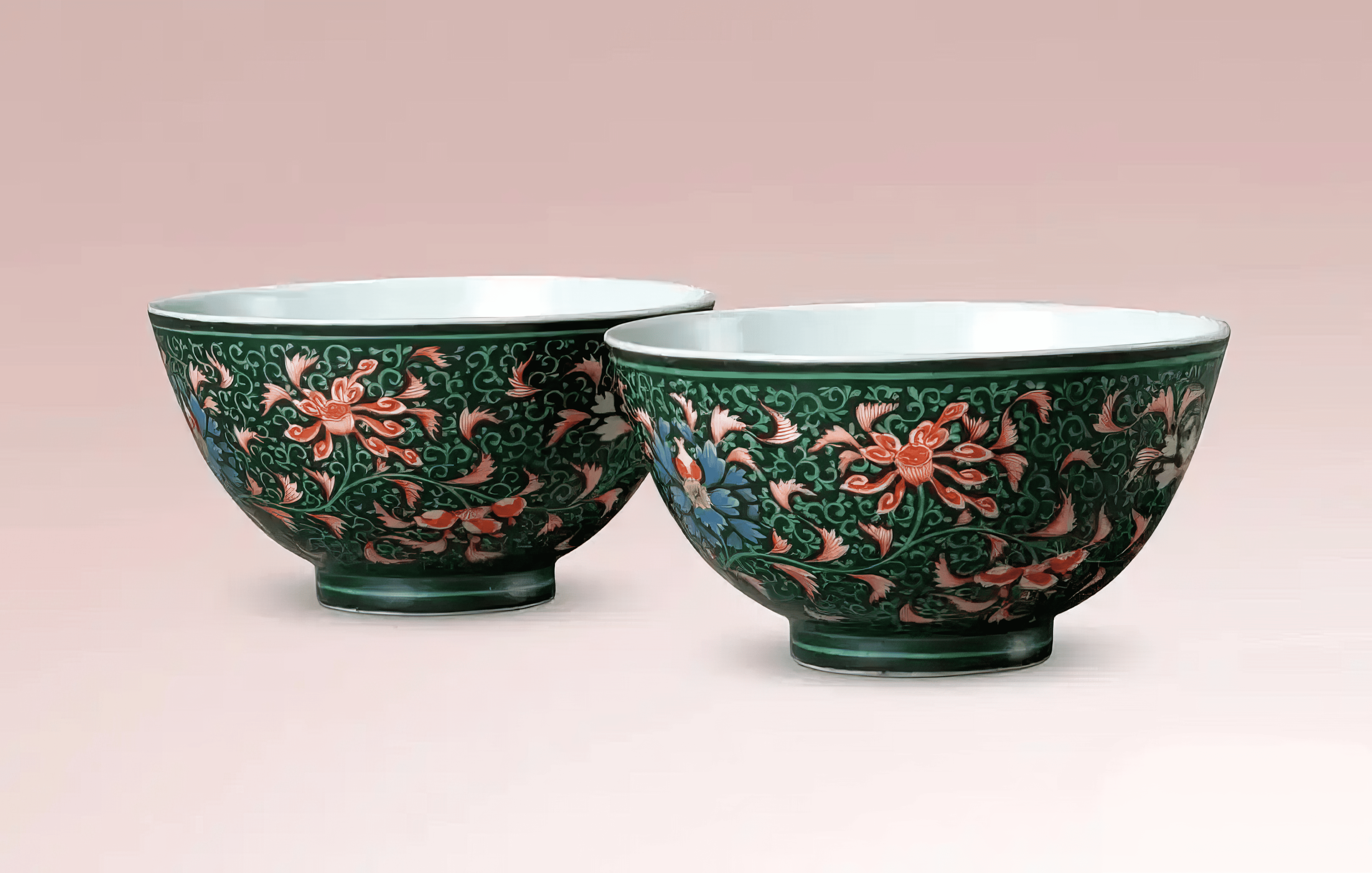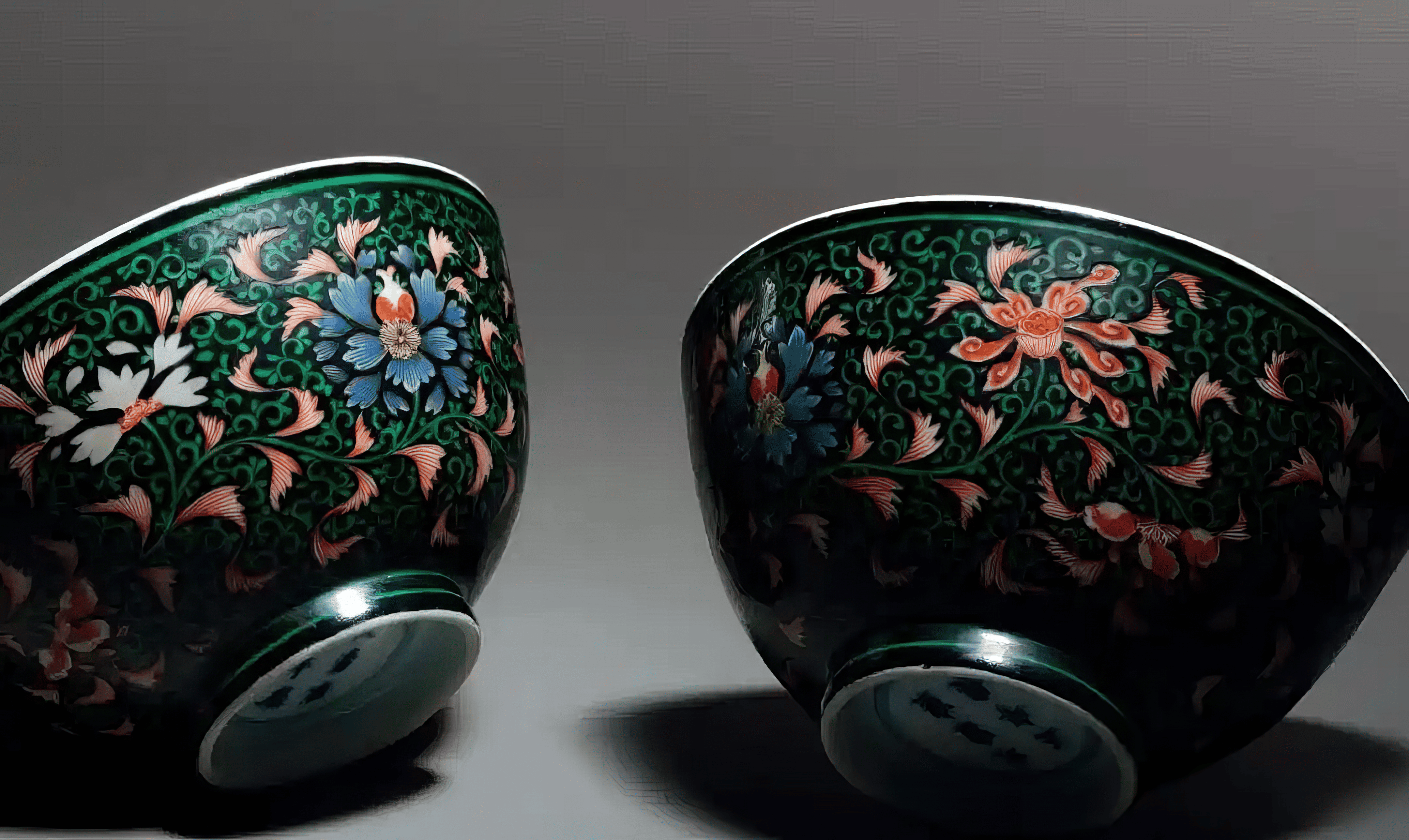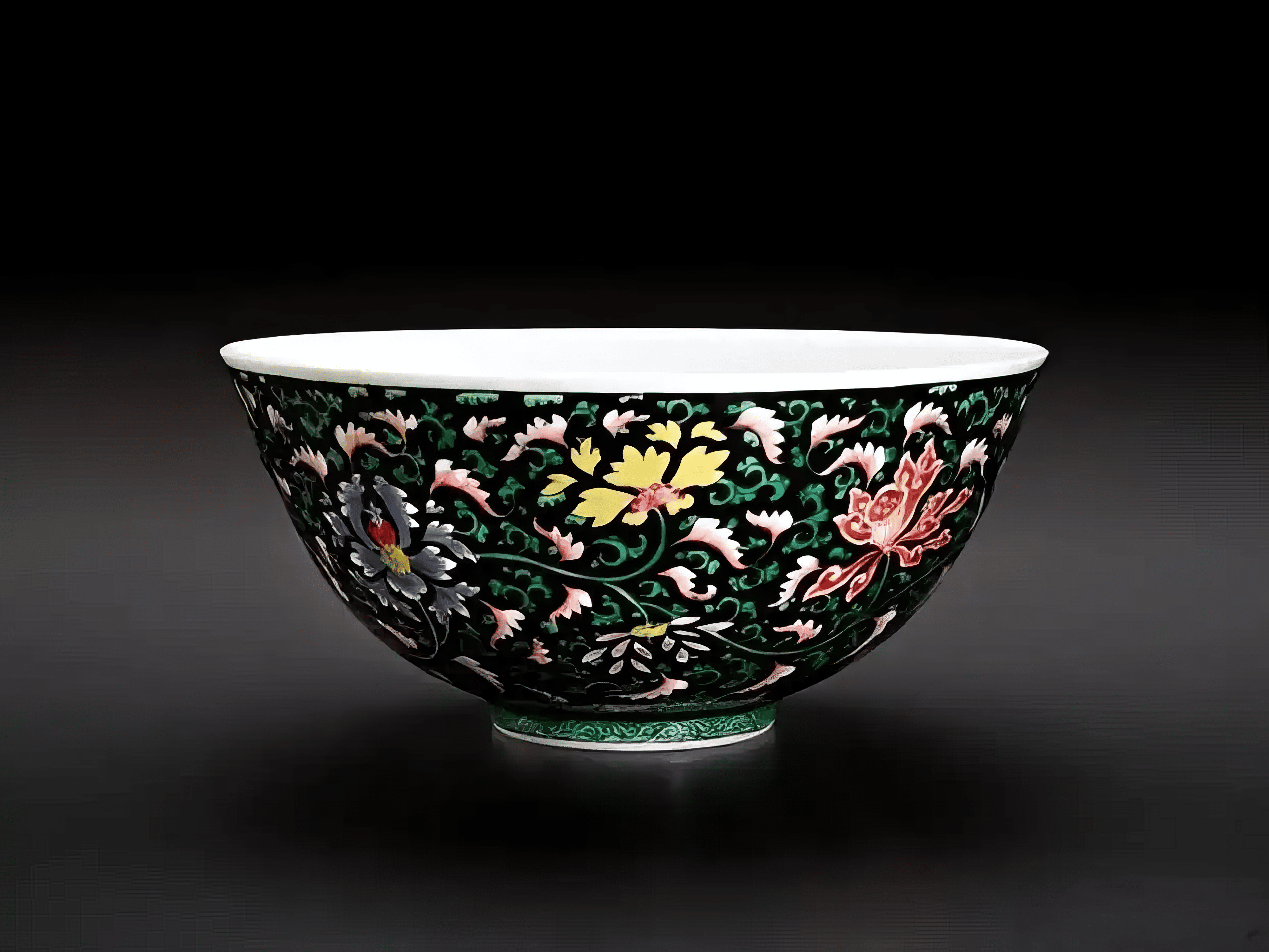 墨地五彩烧造不易,存世甚罕。同类纹饰中以盘类较多见,碗式则寥寥无几,可考者有三例。