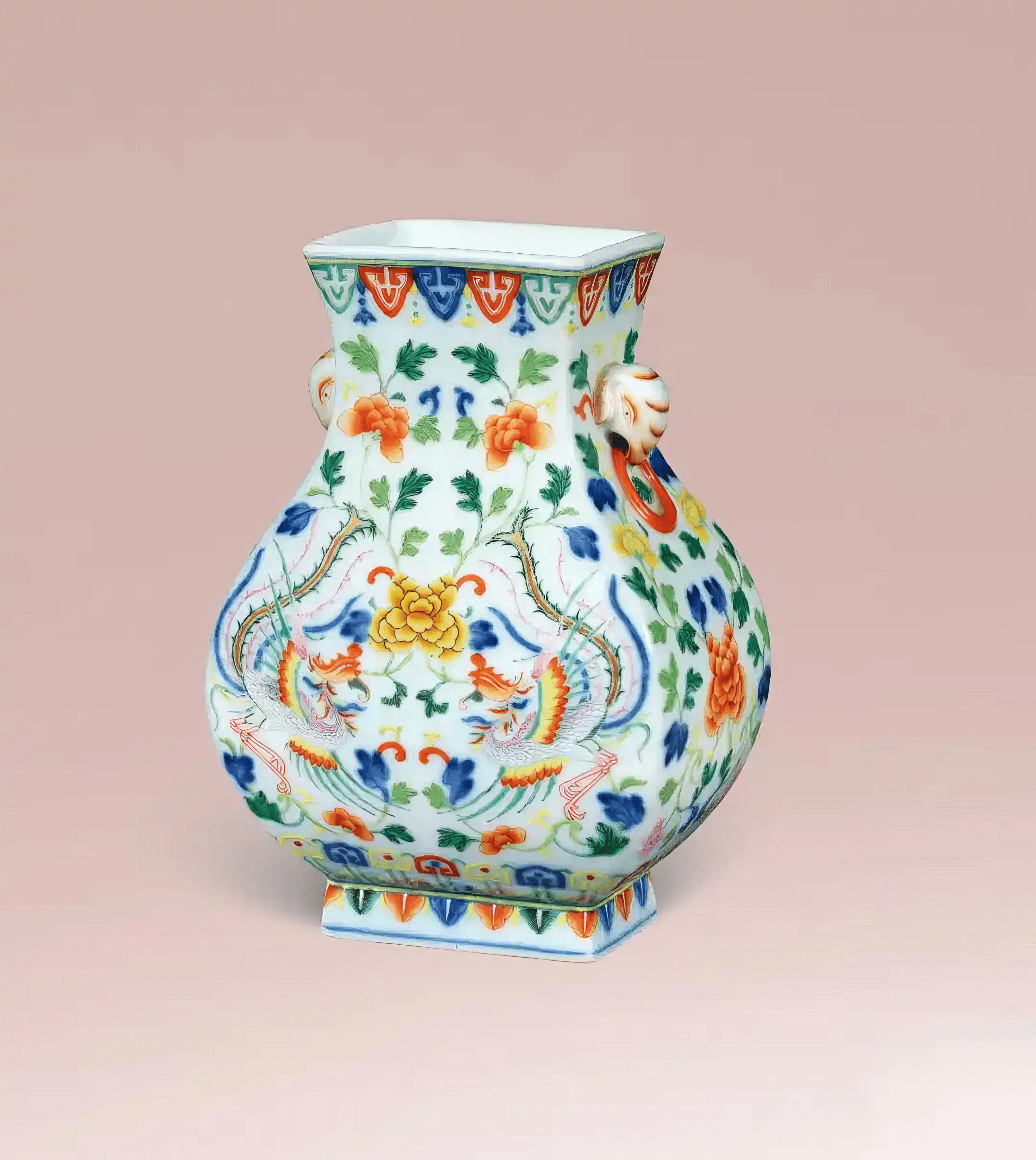 清乾隆 青花加彩「凤穿牡丹」象耳方壶