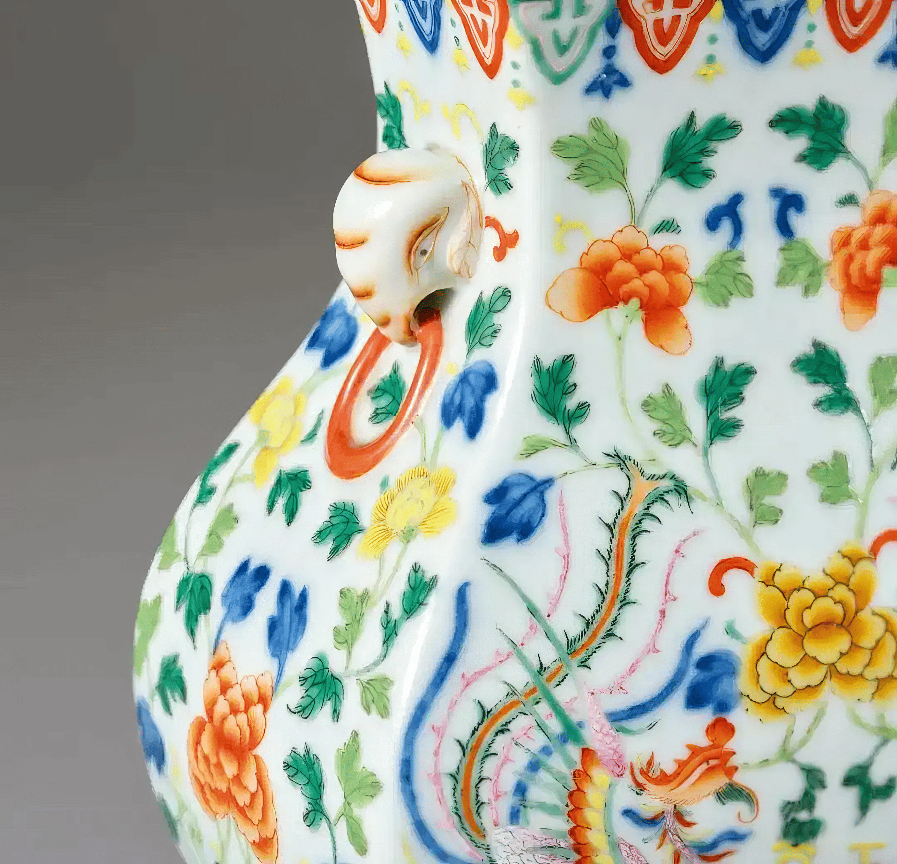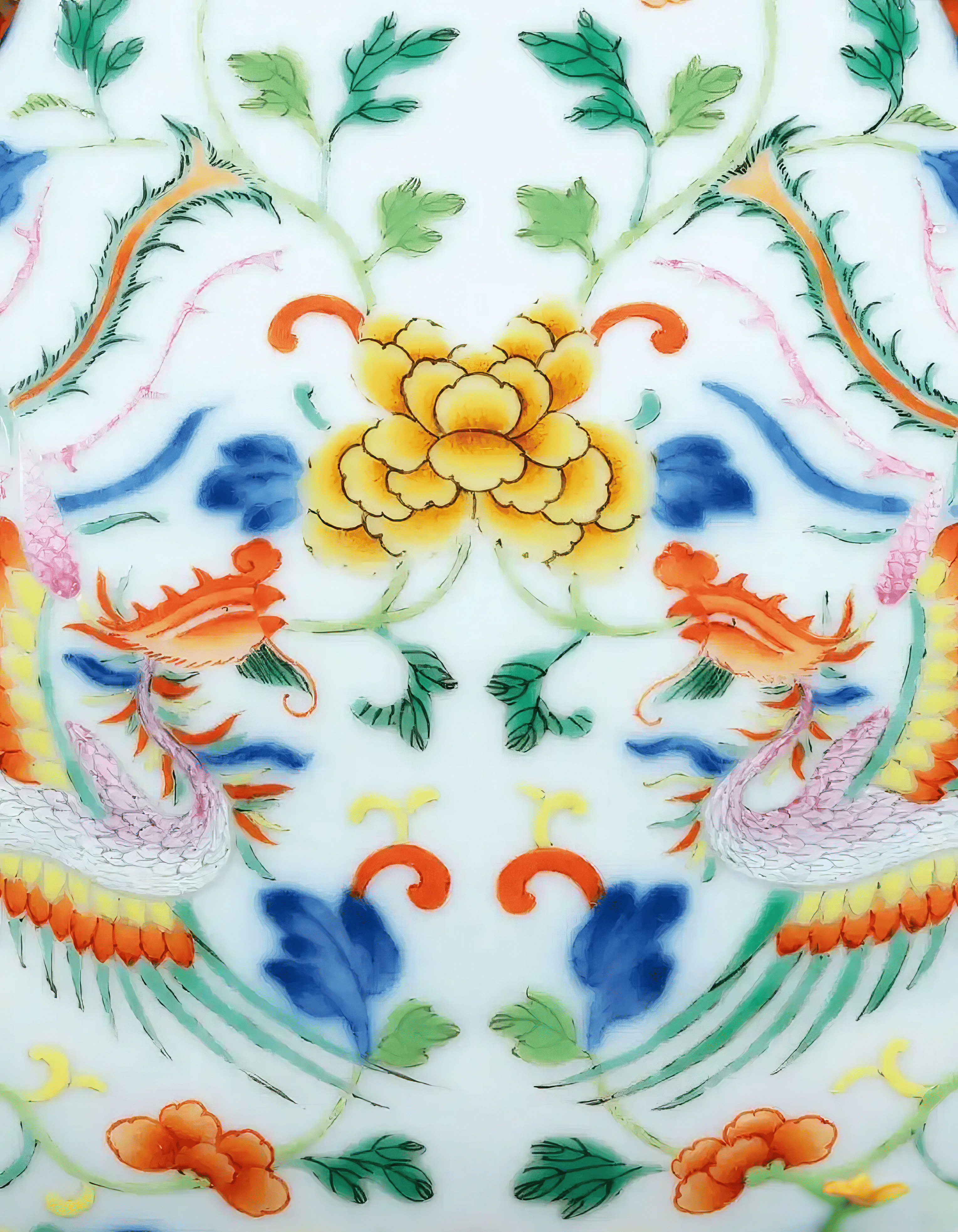 瓶肩处的如意云头开光内,绘有凤凰与孔雀穿花纹样,双凤一上一下,一作回首展翅状,尾羽卷曲;一作俯首飞翔态,双尾飘逸,如天上之景。