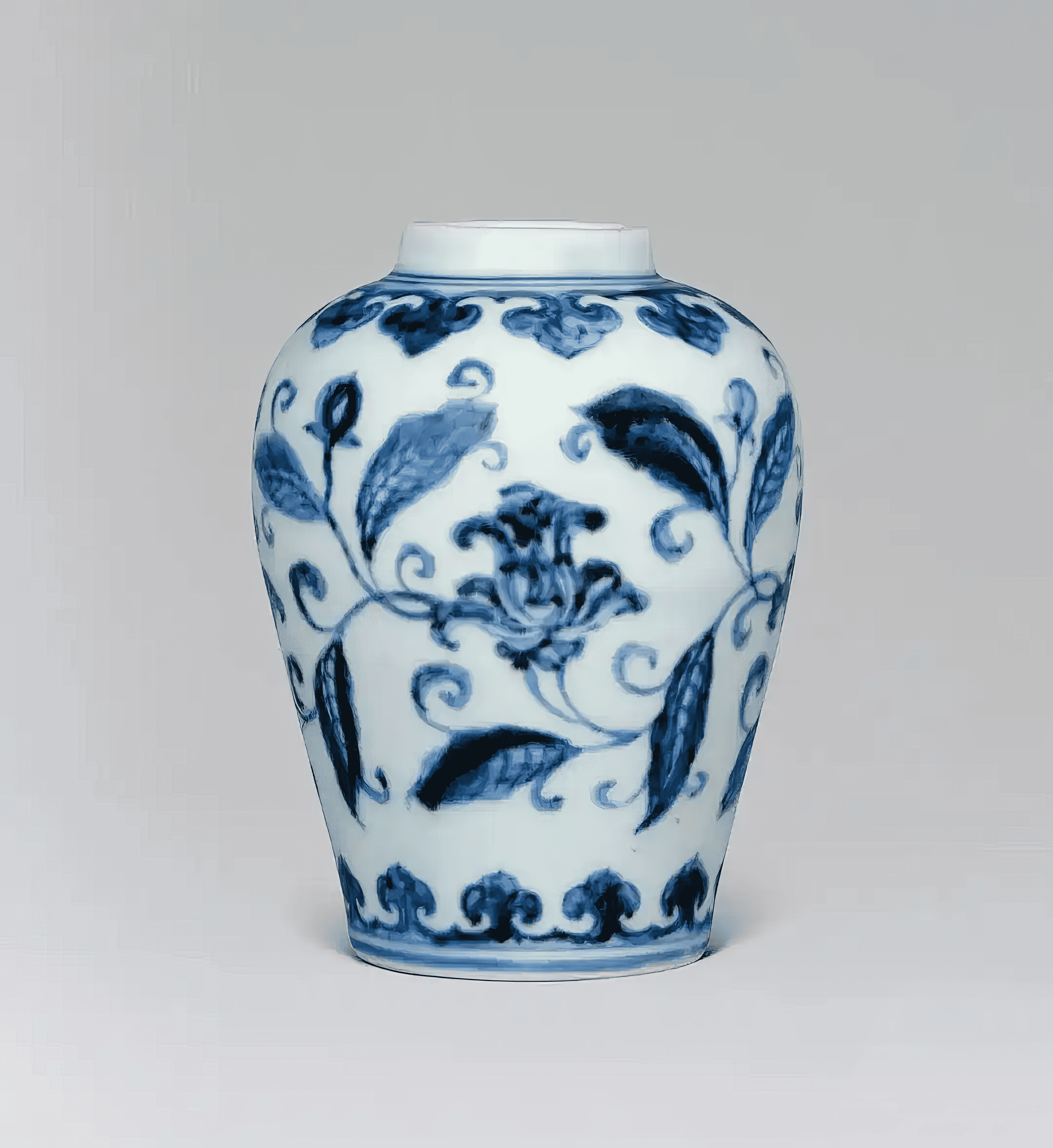 瓶腹中段的「人间」,缀缠枝牡丹纹,乃此类青花梅瓶喜用纹饰。匠人先以青花细线勾勒图案轮廓,再填施青料。枝叶纤细婉转,花苞与盛放之态交替;胫部则收尾于锦纹与变形莲瓣纹,莲瓣内朵花下垂,并缀有滴珠两点。各花瓣间并不相连,留有一定空隙,为元代特色。