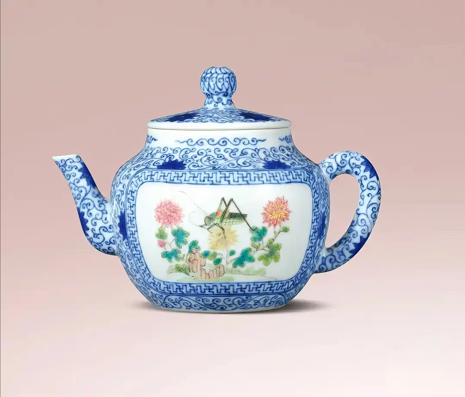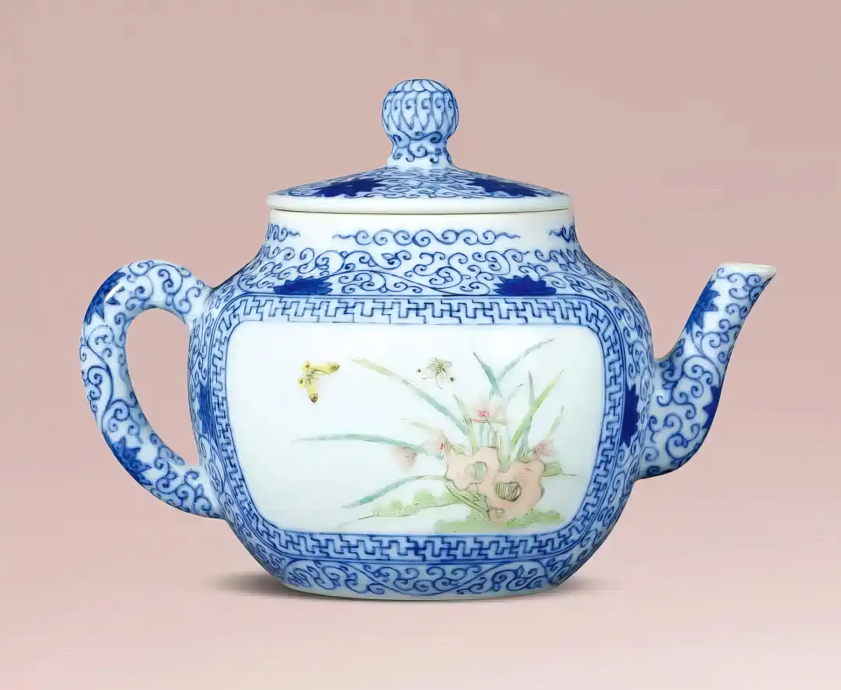 青花粉彩花蝶草虫纹茶壶