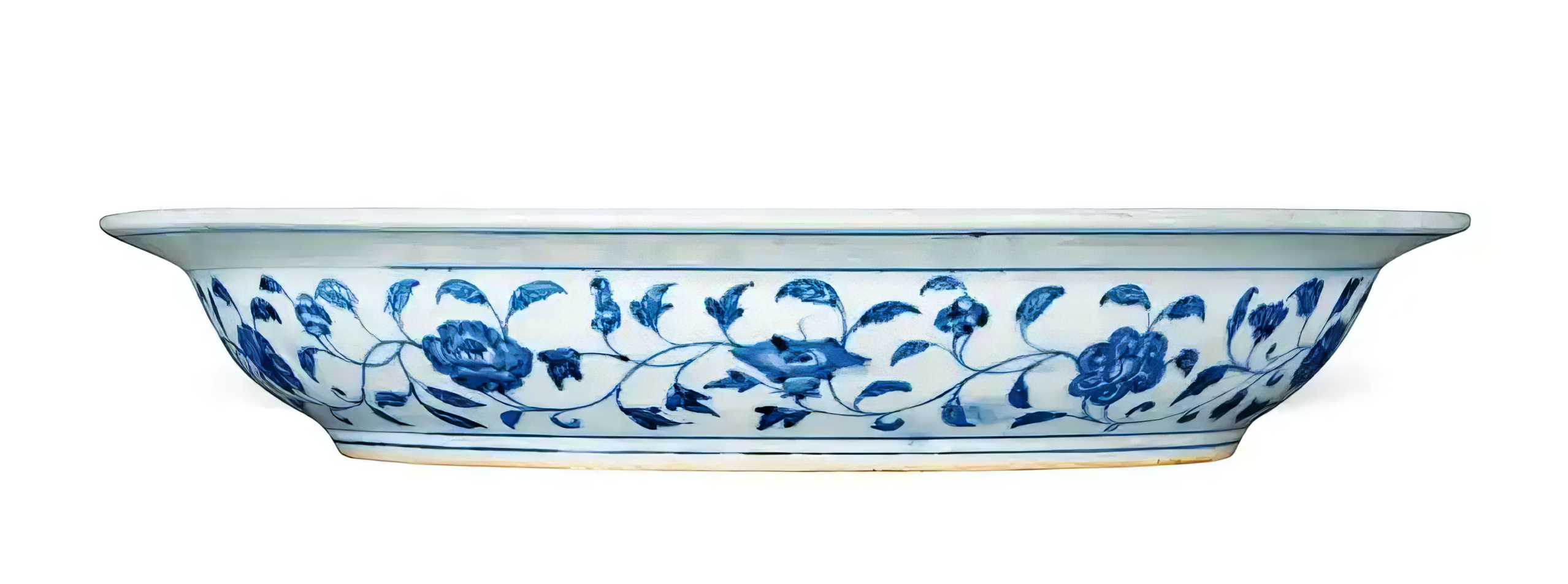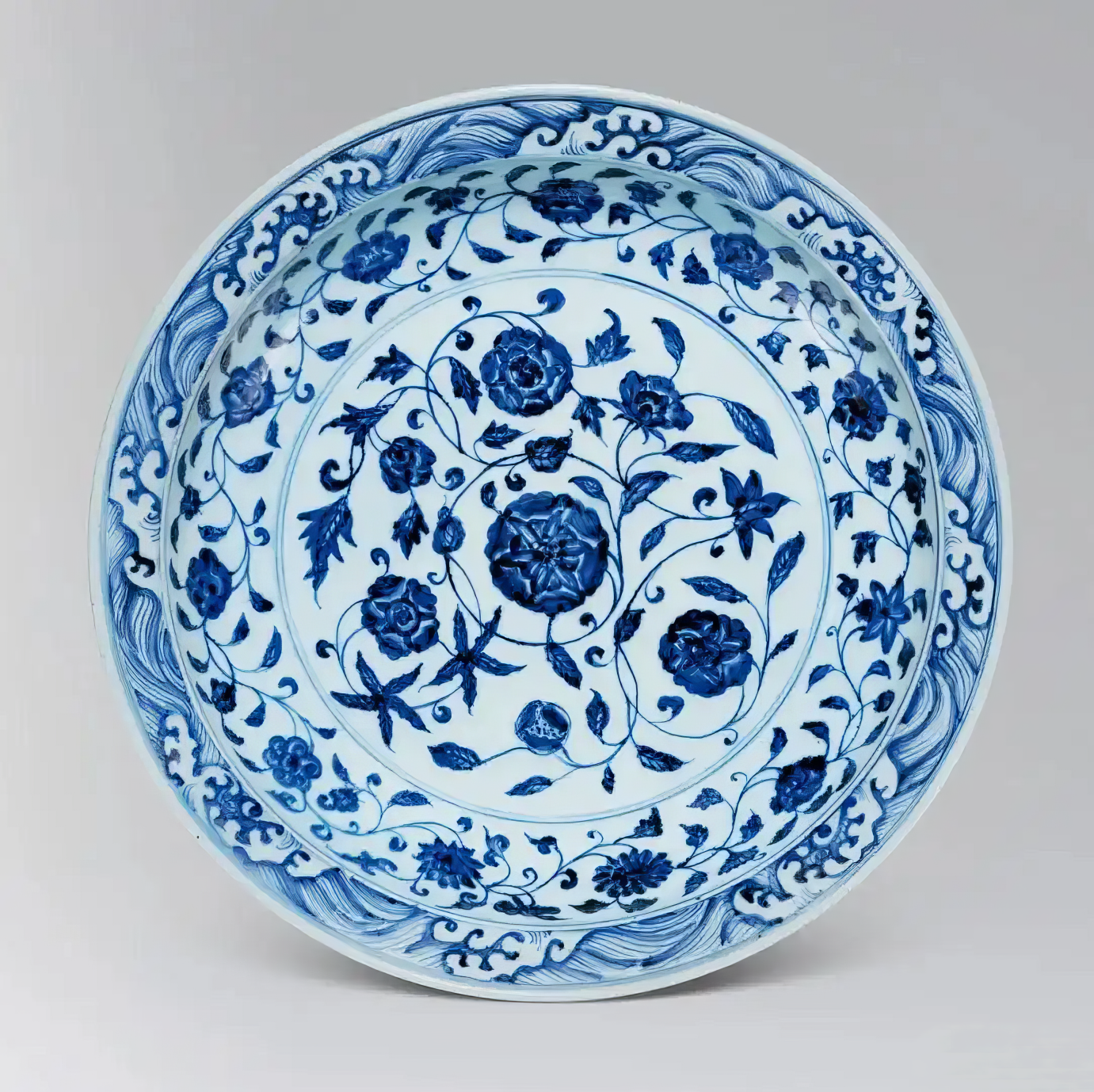 明永乐 青花缠枝花卉海水纹折沿大盘