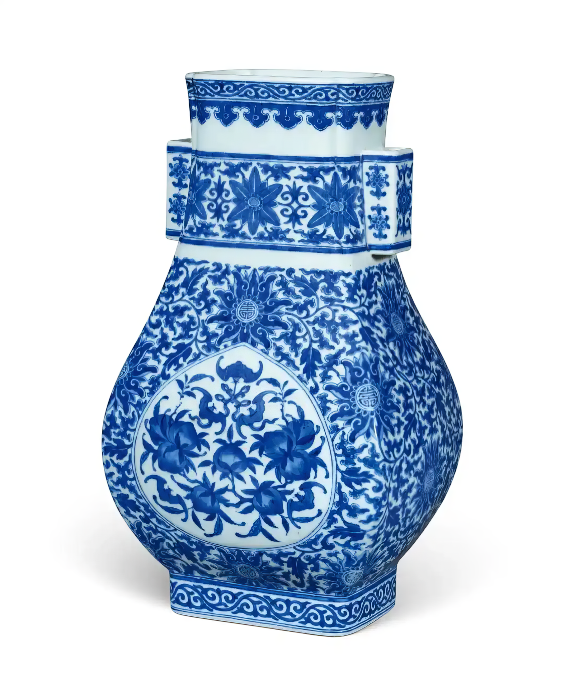 清乾隆 青花仿明式缠枝花卉开光福寿纹方壶