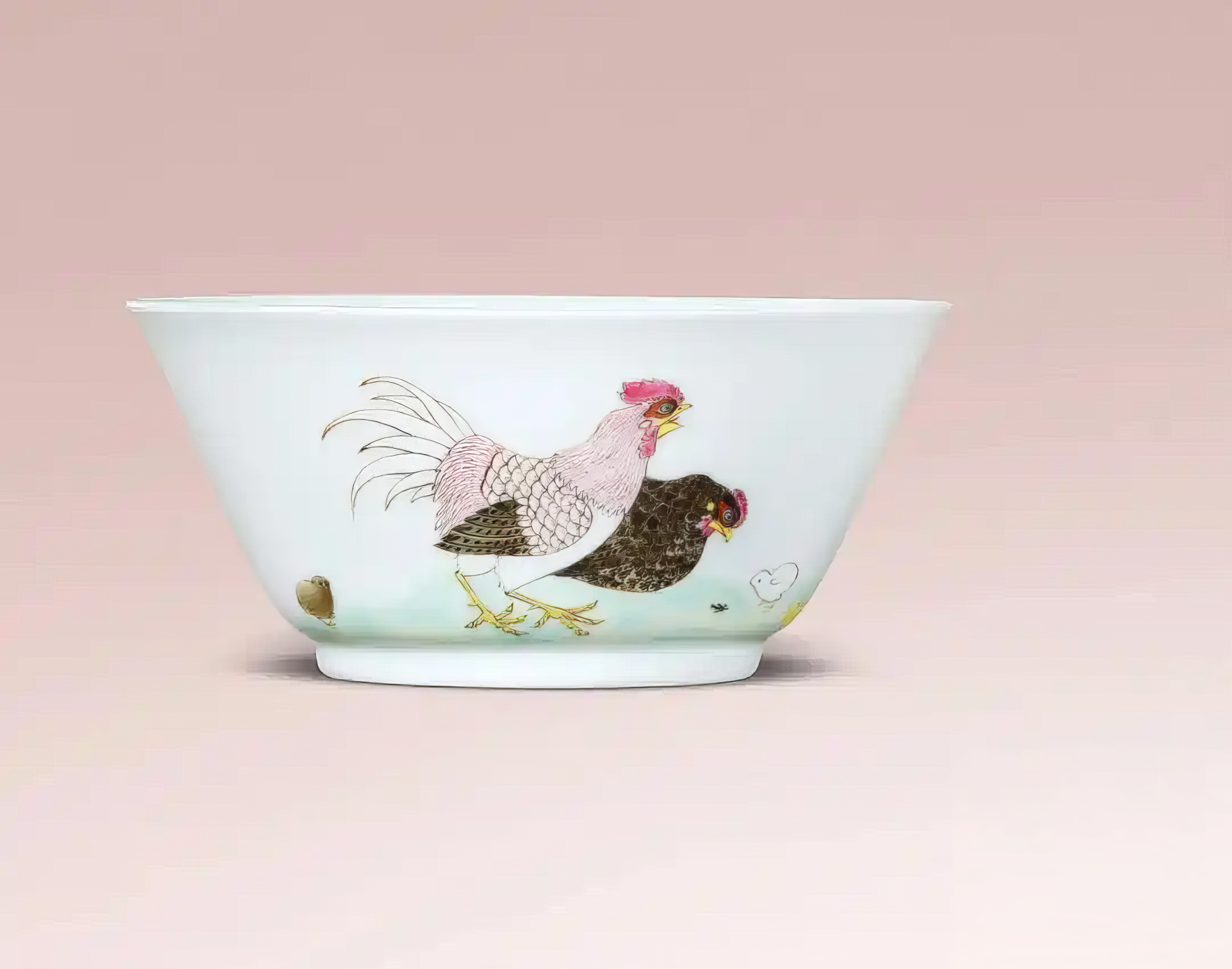这件乾隆朝的粉彩碗,胎骨纤薄,白釉莹润,圈足修整细致。粉彩约于康熙中期出现。它在色料中掺以铅粉并加施玻璃白,有意令色彩不那么浓艳。用分水淡洗法涂饰花纹层次,色阶繁多,色调温润柔和。