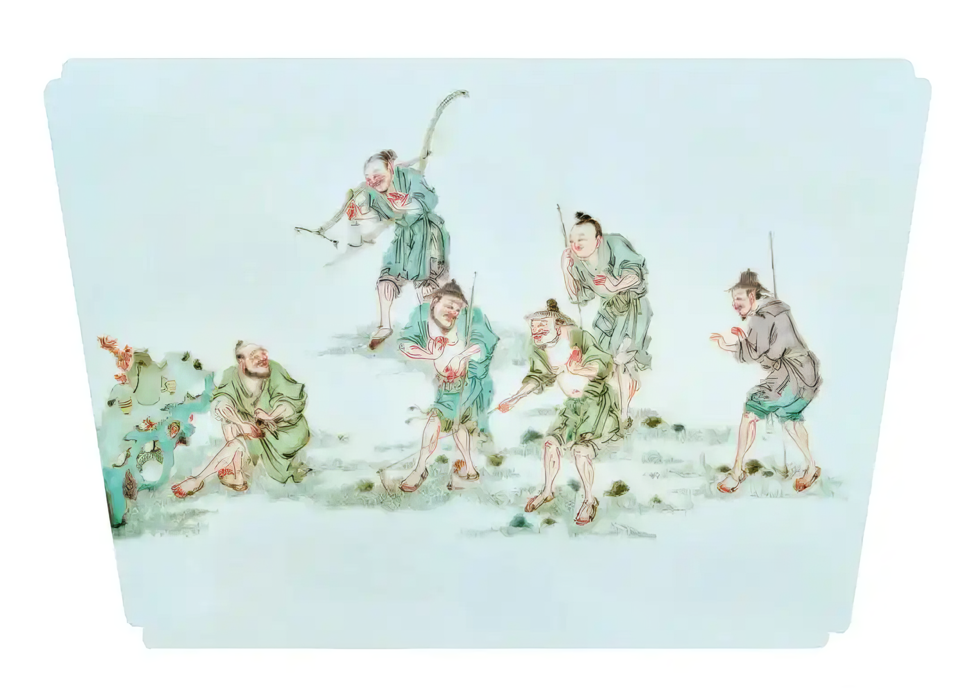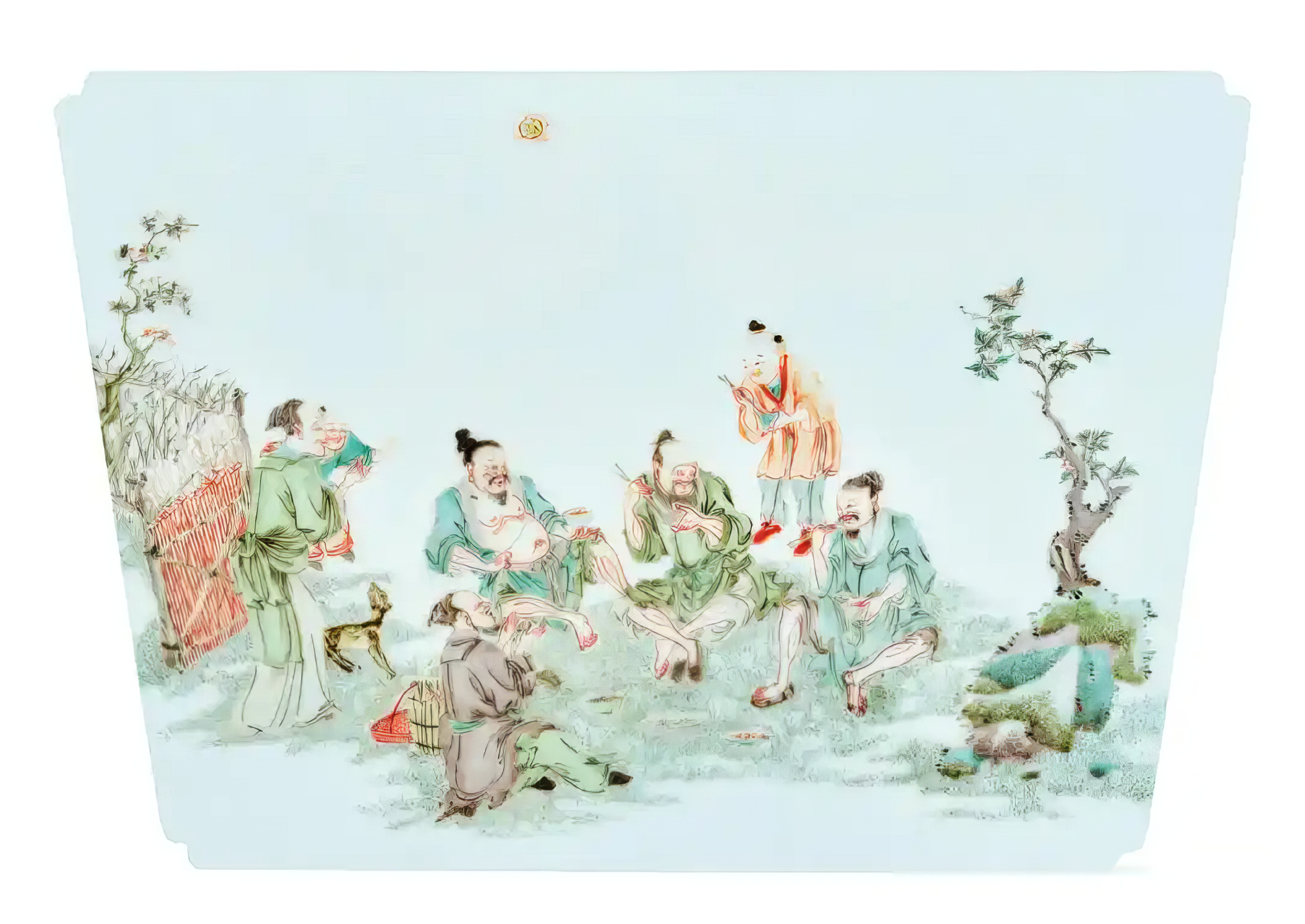 墨彩在雍正一朝迅速发展成熟,形成独特艺术风貌,自此从五彩体系中脱胎而出,成为独立品种。施作色地时,以珠明料描绘纹样,再罩施一层水绿,经低温烘烧后,釉色黝黑莹亮,并隐泛绿意。
