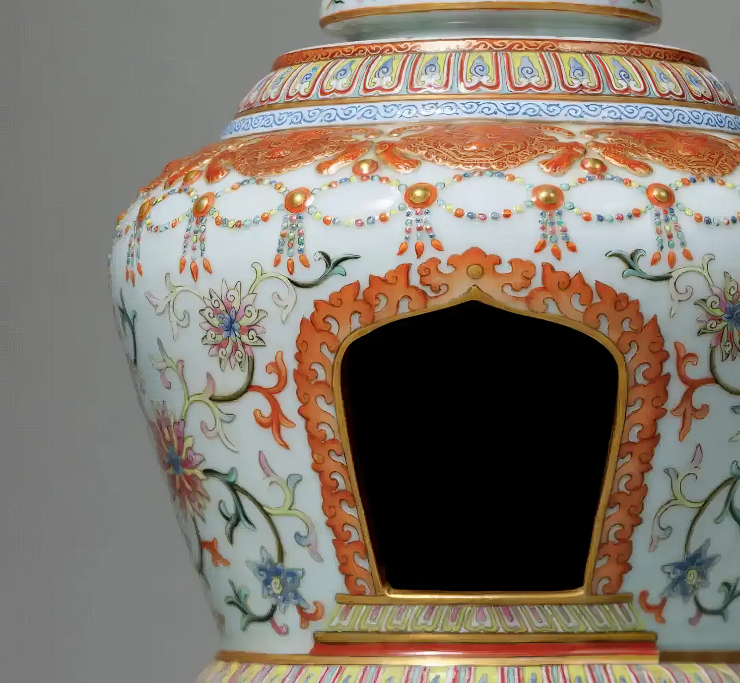 所绘花卉西洋气息浓郁,花叶翻卷舒展之态与欧洲巴洛克装饰风格相契,与清宫传统彩瓷装饰风格大相径庭,正是雍正朝西风渐盛之时代写照。