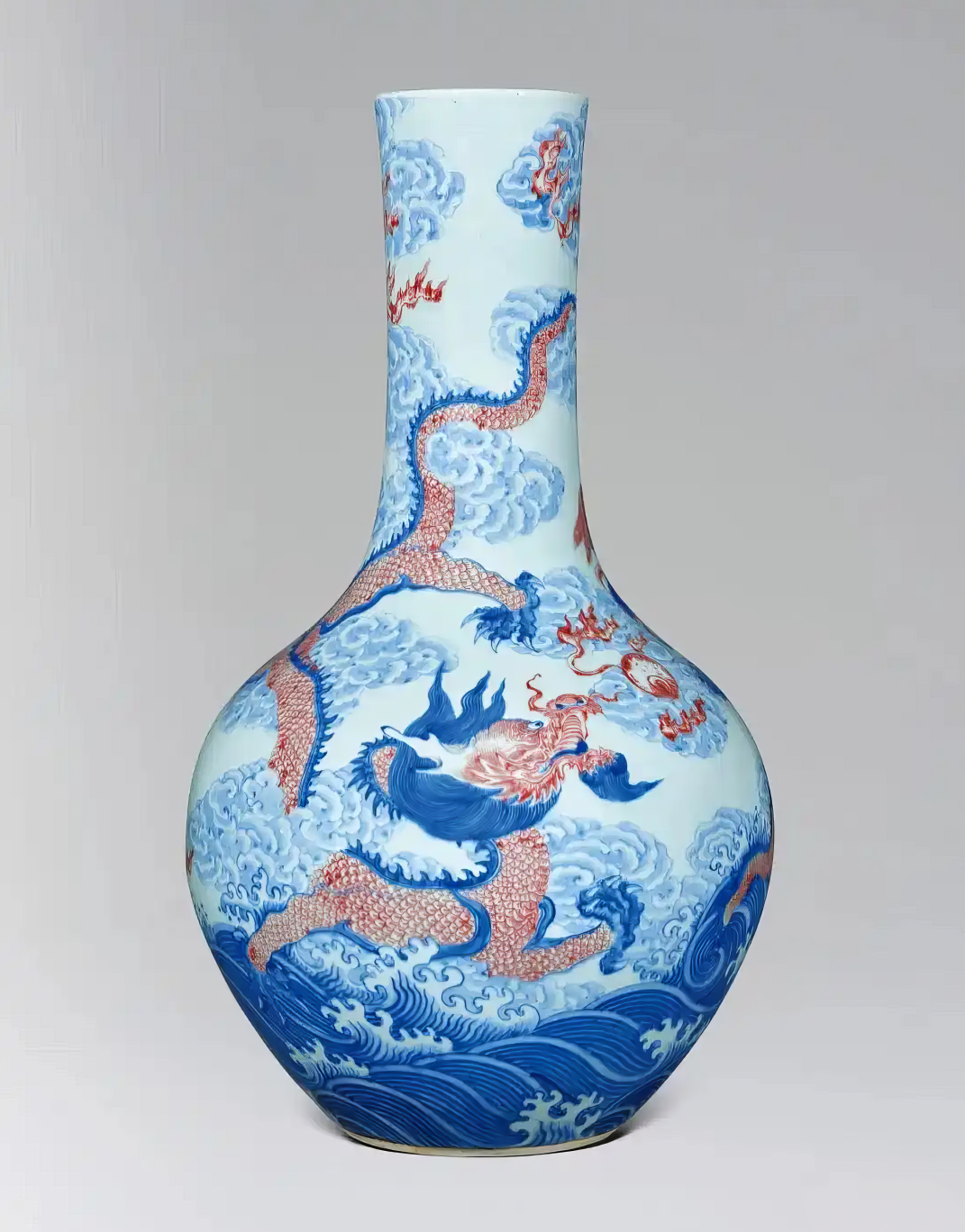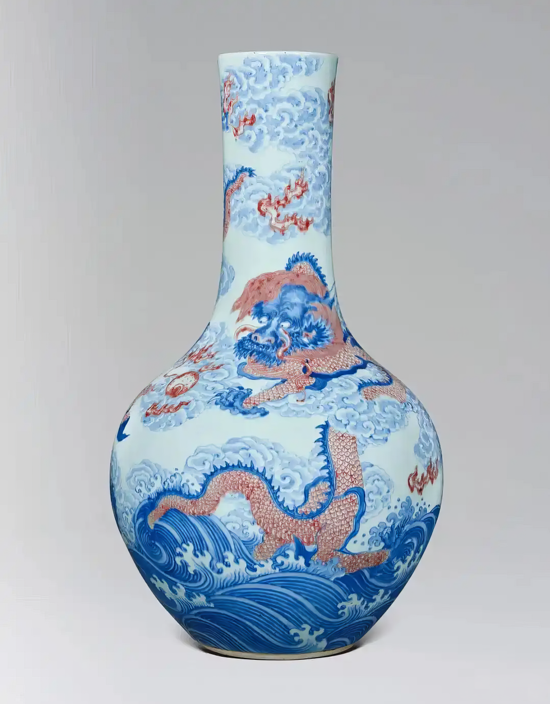 清雍正 青花釉里红「苍龙教子」图天球瓶