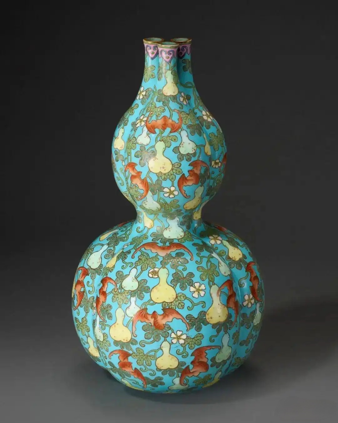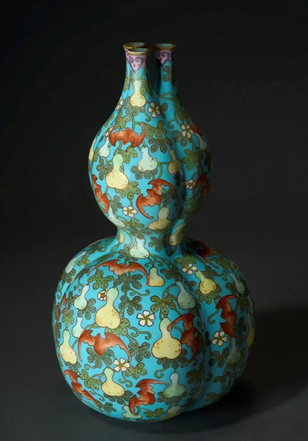 清乾隆 松石绿地粉彩葫芦三联瓶