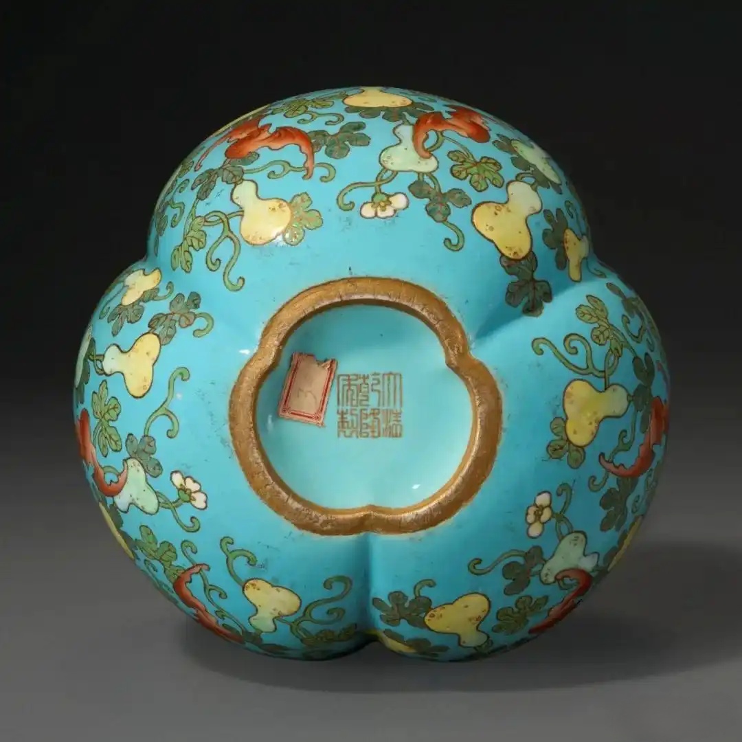 本葫芦瓶即为箇中佳例,以匀净明艳的松石绿釉为地,仿景泰蓝常用的蓝色珐琅,几可乱真。匠人先在器身上刻划图纹轮廓,再以金彩勾勒,故立体感很强,视觉上更似是金属掐丝的质感。底款亦特别选用暗刻描金书写,在细节上尽善尽美。