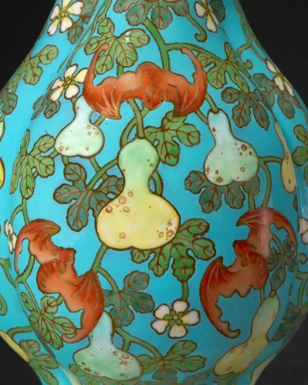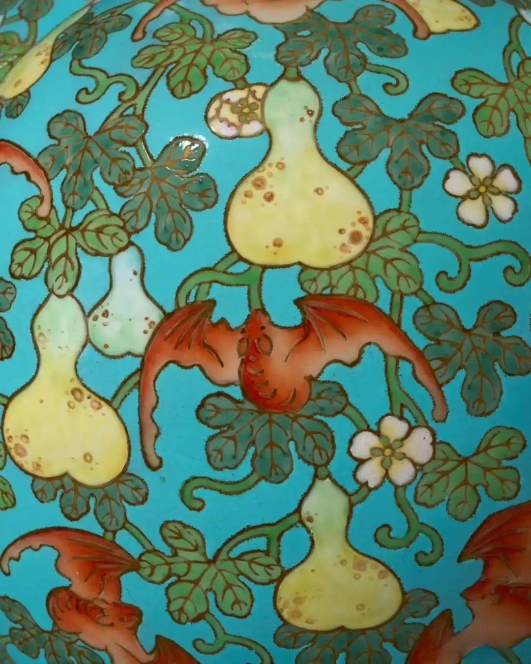 施彩工艺方面,葫芦纹饰由淡绿自然过渡至暖黄,并点缀斑驳褐斑,描绘果实成熟时之天然样貌。枝叶繁盛,花蕊错落,红蝠翩然穿梭其间,布局张弛有度。藤蔓攀附交叠,色泽深浅有致,配以蝙蝠阴影的细腻渲染,更显立体生动,仿佛跃然于器面之上。