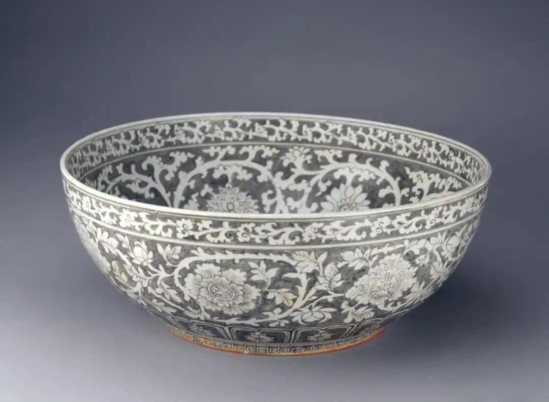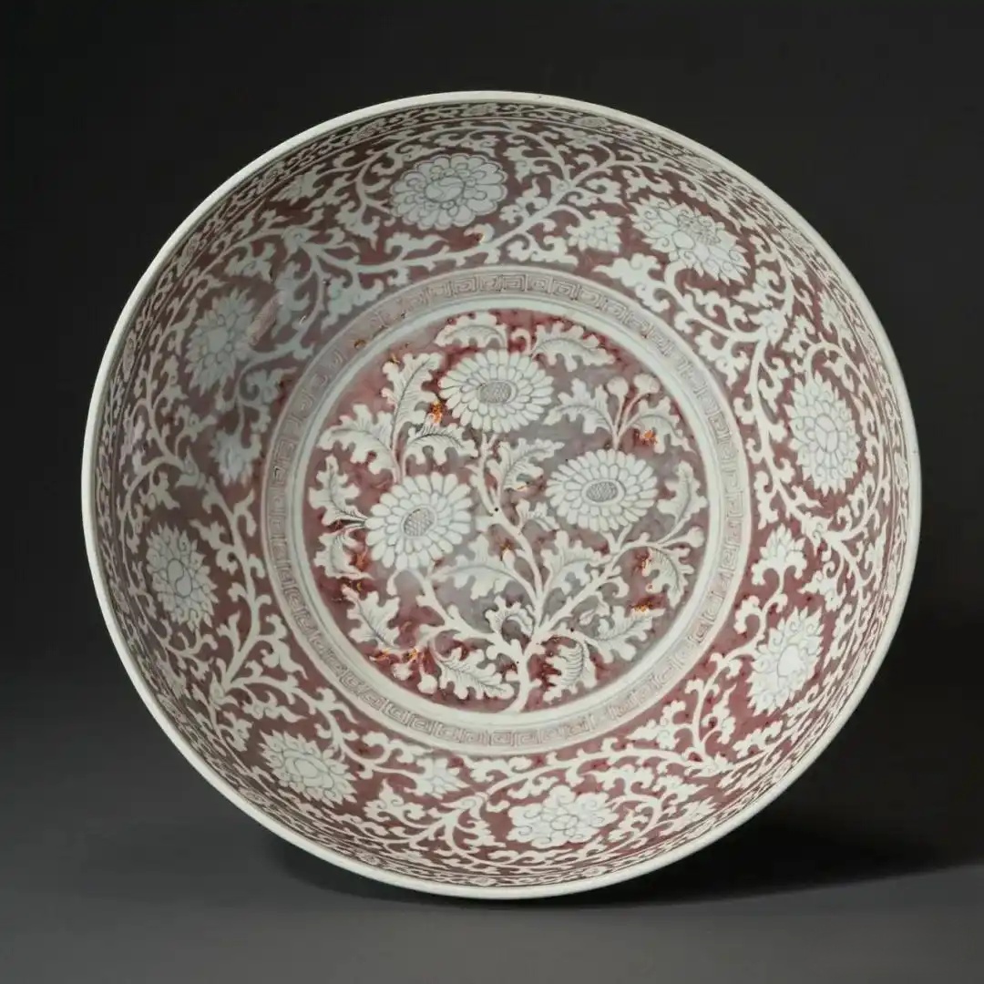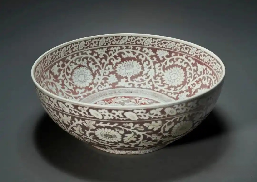 此大碗造型宏阔,直径达42.2 cm,在浓郁的釉里红色地上,以「拔白」工艺勾勒出明快写实的白色花卉纹饰,无疑是洪武御瓷佳器。