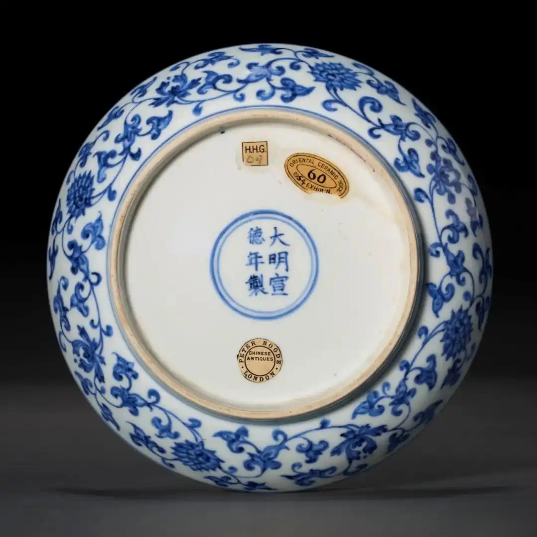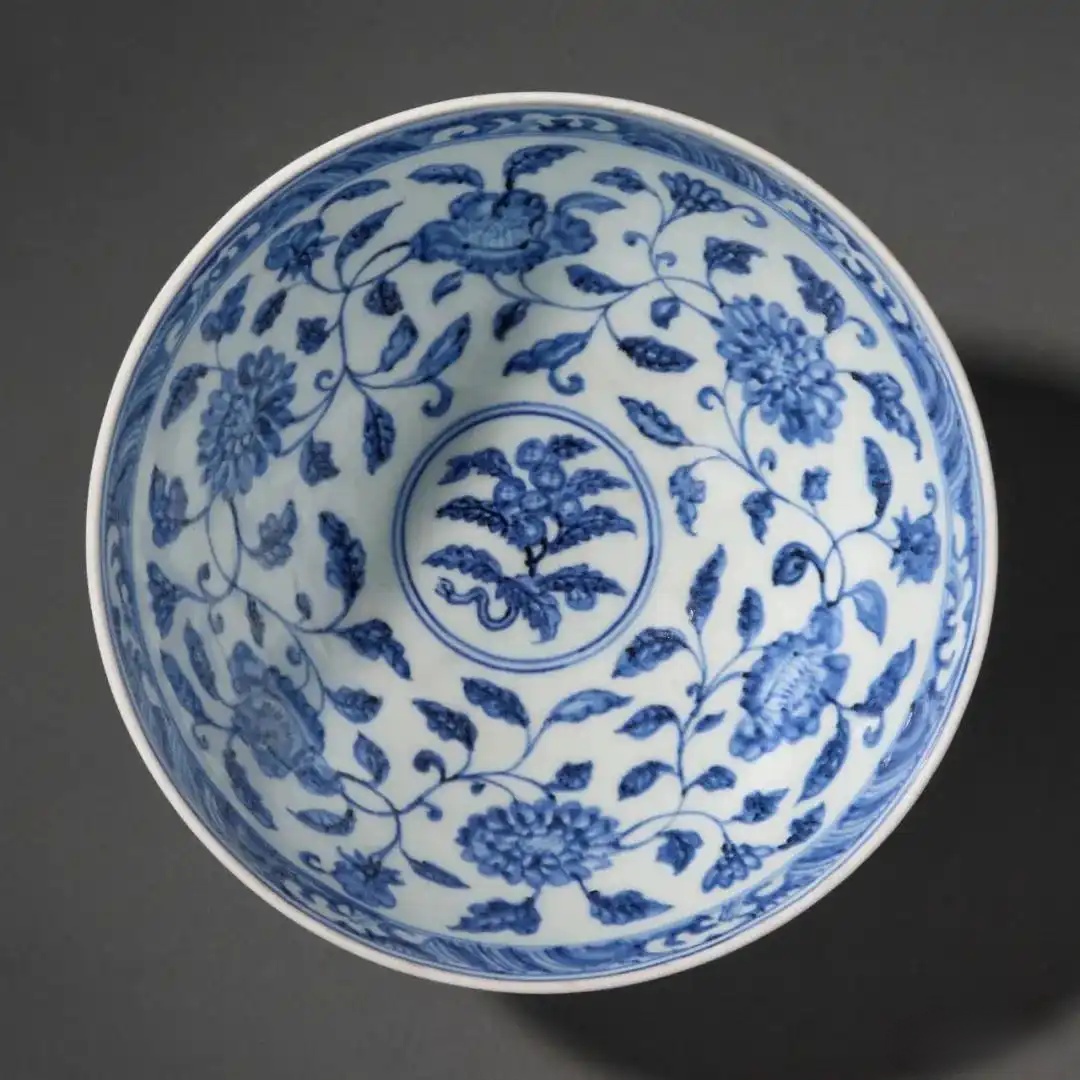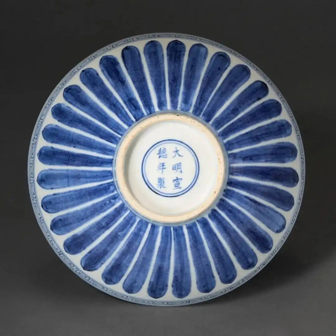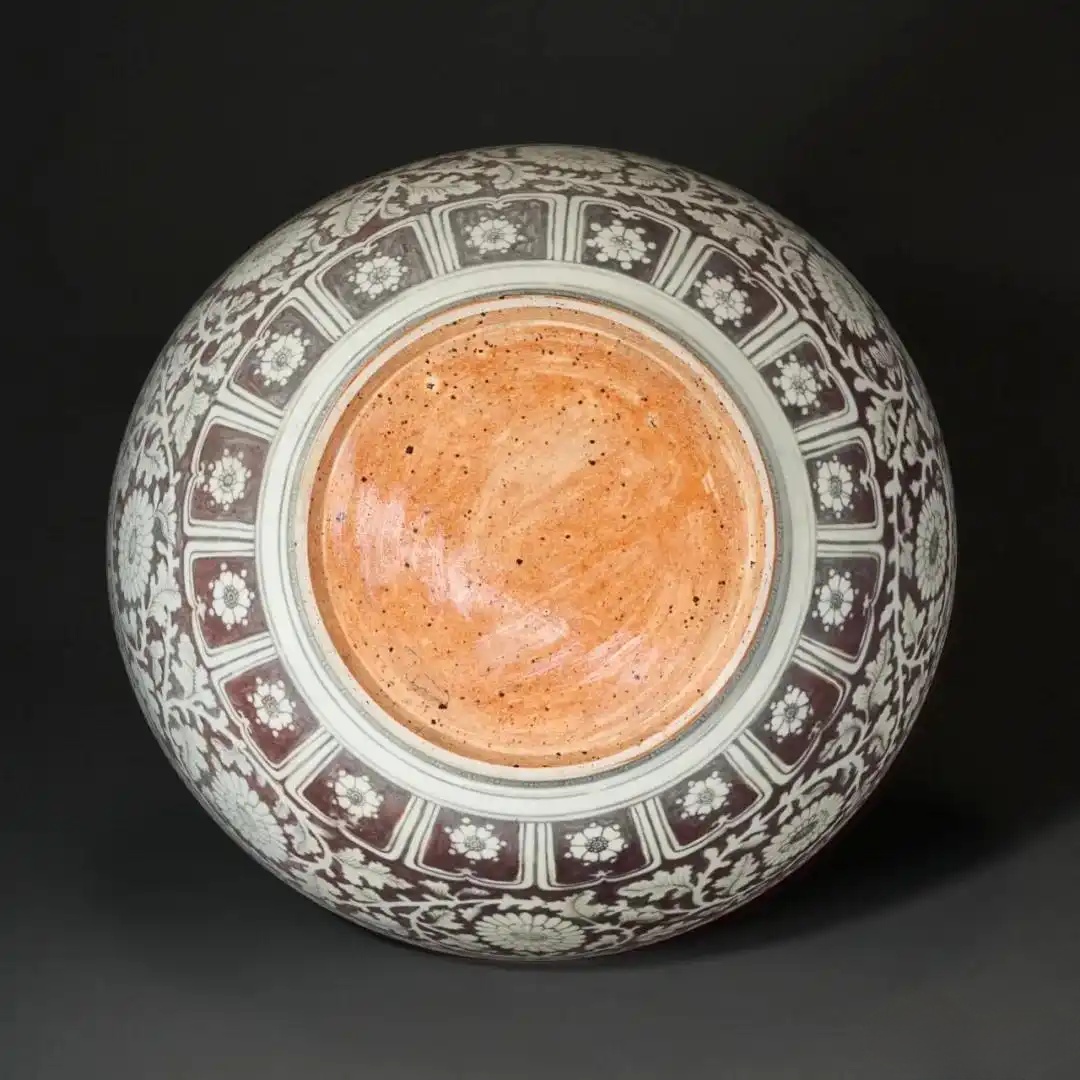 留意菊花纹形态,不似后世那般圆润对称,而是呈现特有的椭圆状。此乃鉴藏界所称的「扁菊花」,为洪武朝代表性的流行装饰,进一步赋予器物鲜明的时代特色。