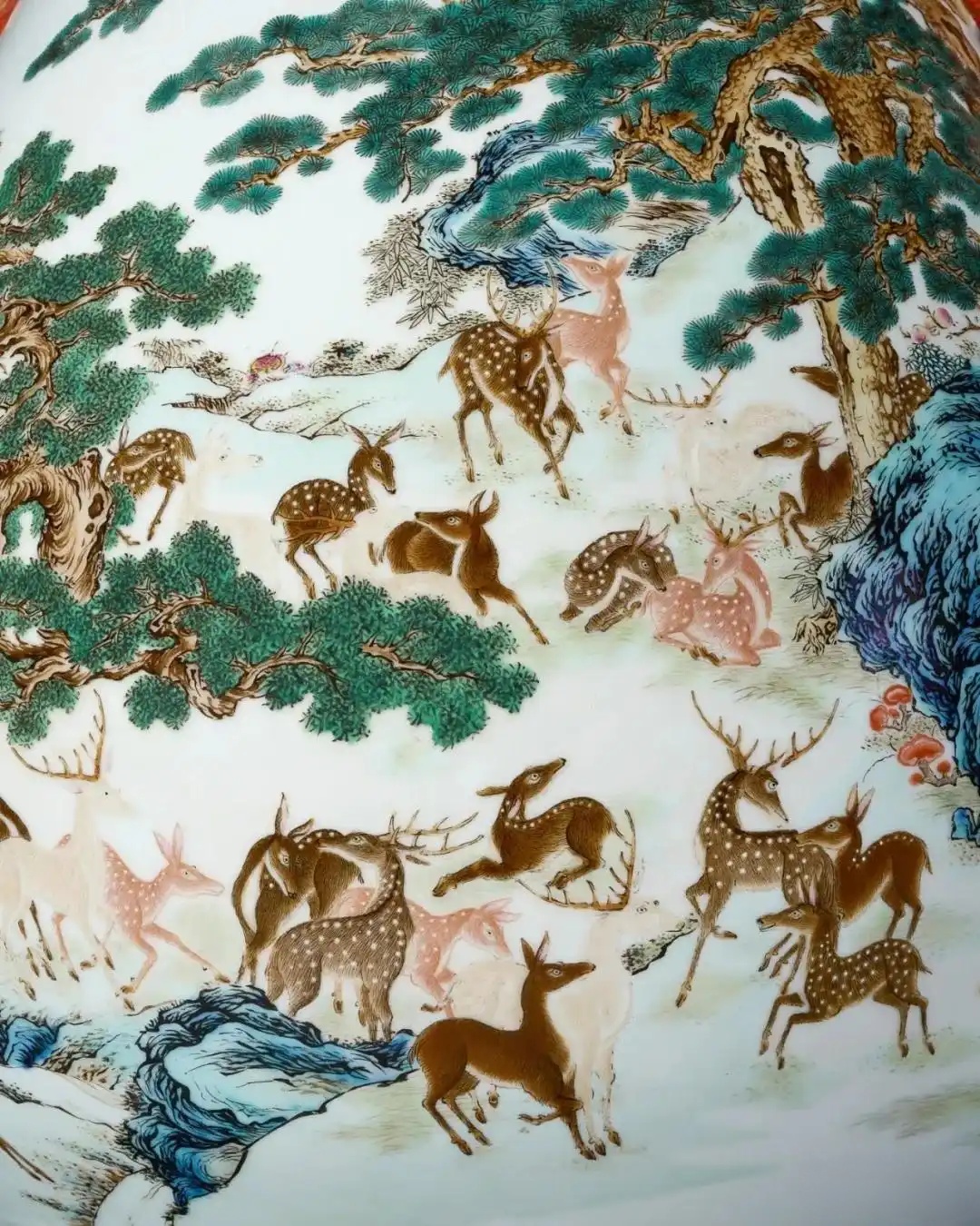 瓷器上通景绘画本来就非易事,此尊环形弧面,对绘功要求更是严厉。传奇督窑官唐英曾言道,画师须「熟谙颜料、火候之性,始可由粗及细,熟中生巧,总以眼明心细,手准为佳。」也就是说,画师不但要具备出神入化的绘画功力,更需花费大量的时间精力,全神贯注,精雕细绘,方能成就巧夺天工的百鹿尊。