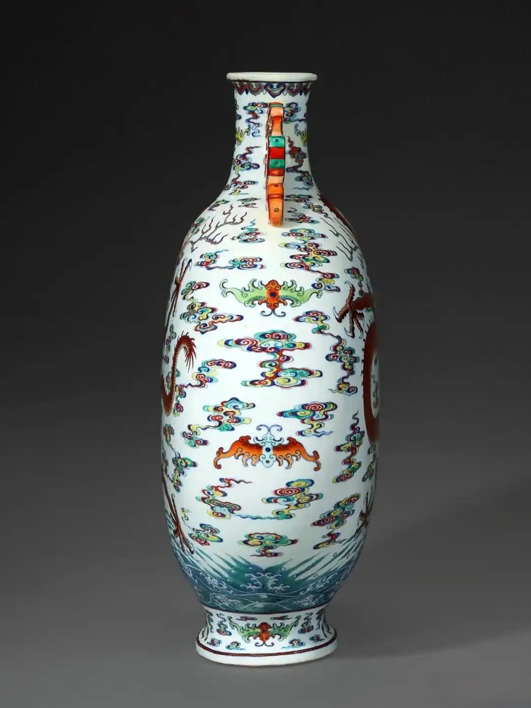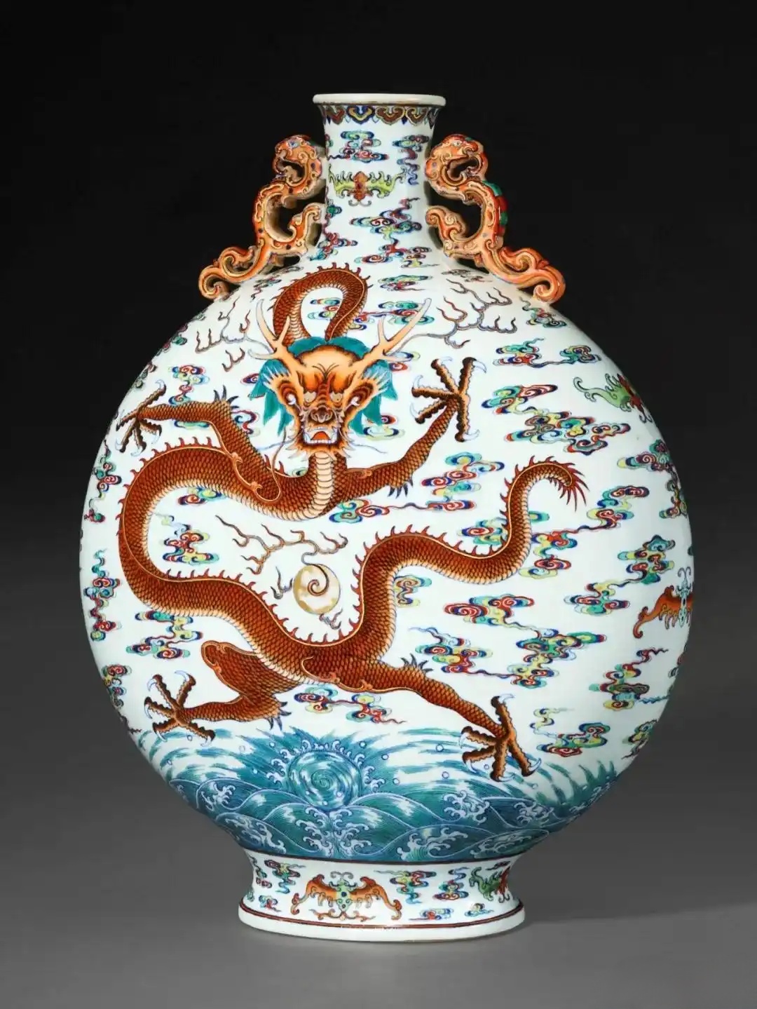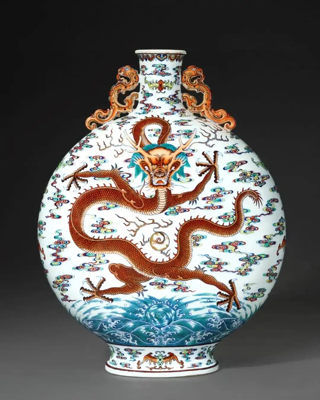 乍看之下,以为这是一件工艺非凡的景泰蓝(铜胎掐丝珐琅);然而留神细赏,觉得图纹和用色极是罕见,发现此器实为瓷胎,自然为乾隆御窑的鬼斧神工而惊叹;接着翻查资料,得悉本品为市场孤品,存世三件相同例子皆为博物馆珍藏,包括北京故宫、山东省博物馆、东京国立博物馆。