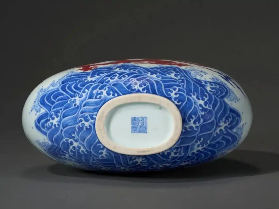 装饰技法相当考究:需先绘制纹饰轮廓,再以细腻笔触涂抹底色背景。这种技法不仅耗时费神,更因釉下铜红发色难以掌控,致使成器率甚低。