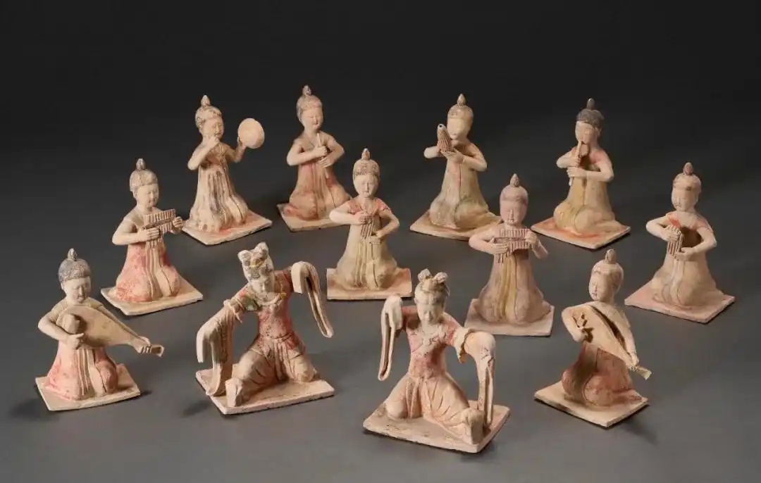 唐 彩绘描金乐舞俑一组十二件