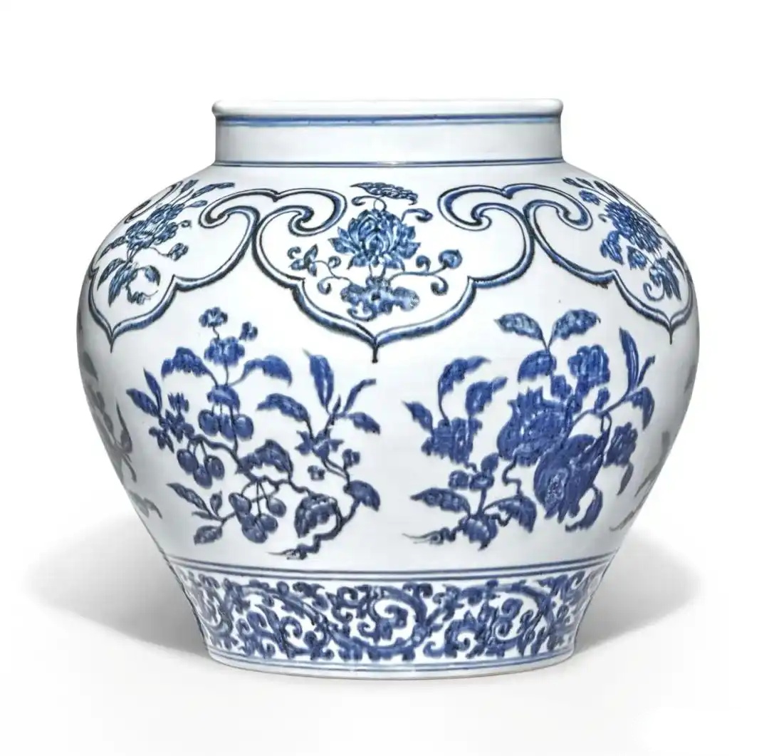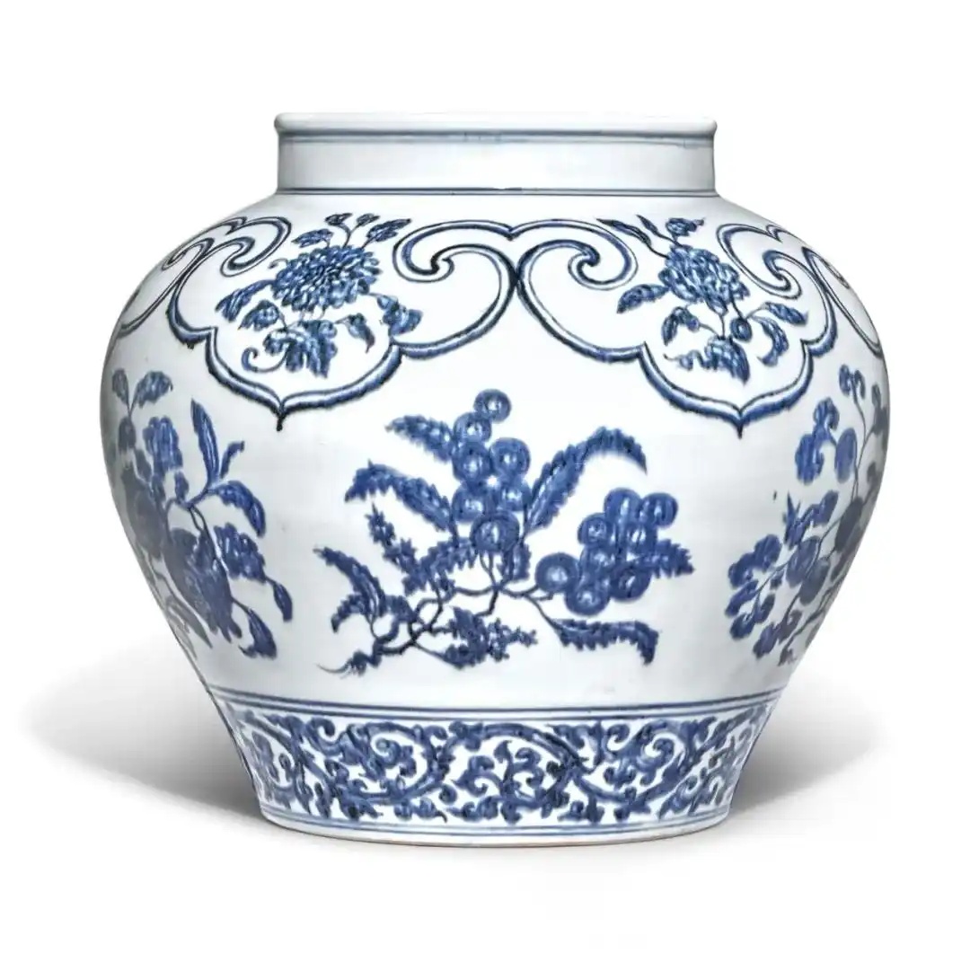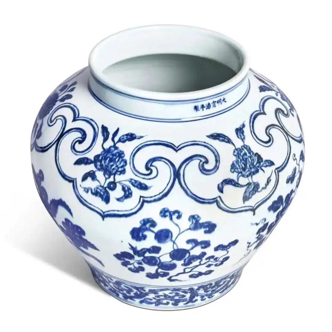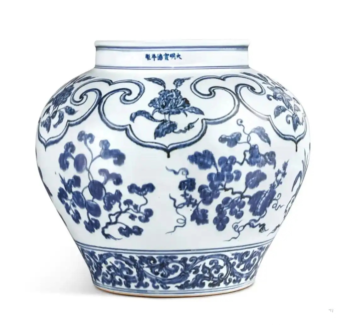 本罐器身以花果纹为饰,象征长寿多子。翻查资料,迄今未见纹饰相近、署宣德年款、尺寸同样硕大之罐例。