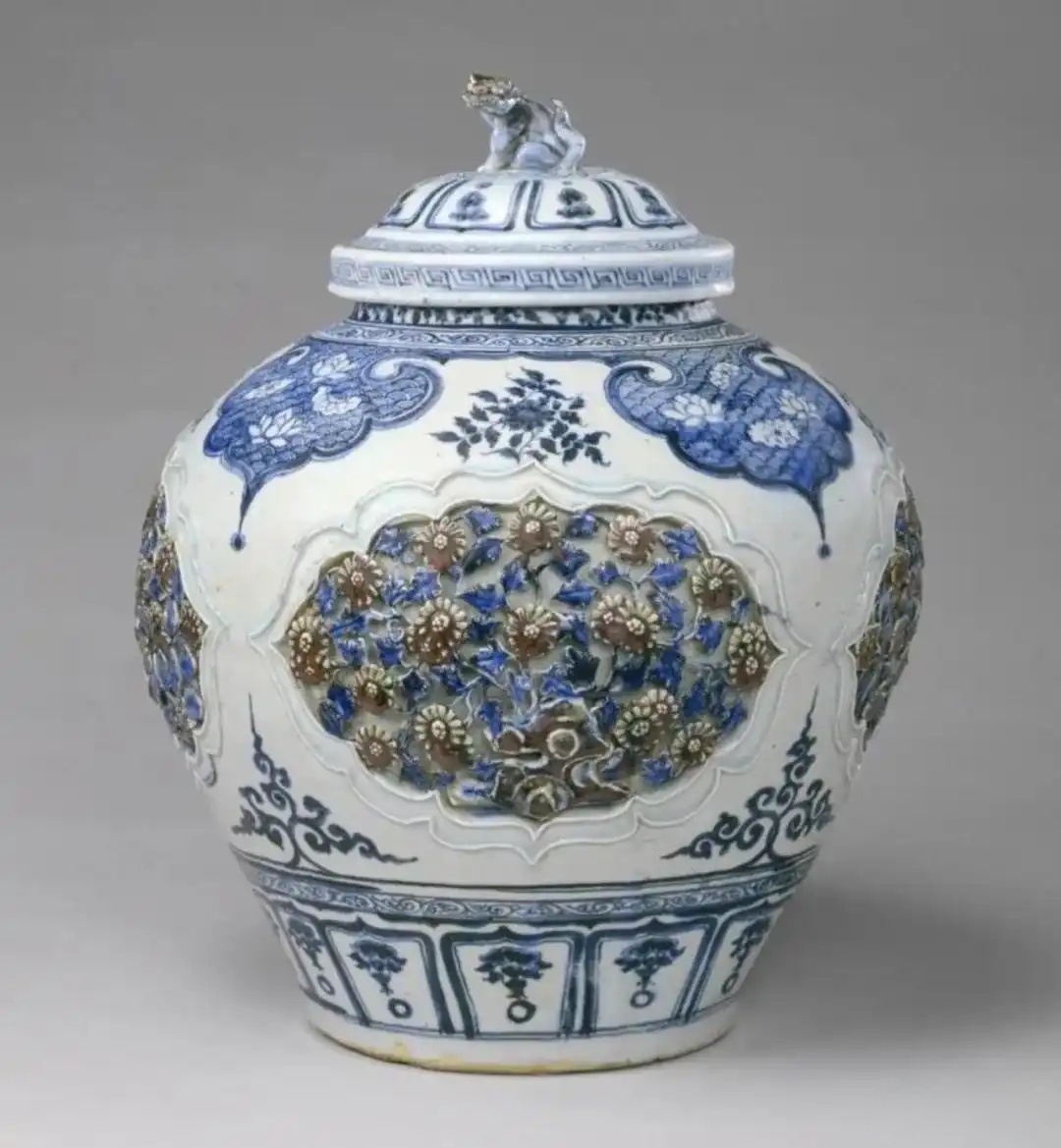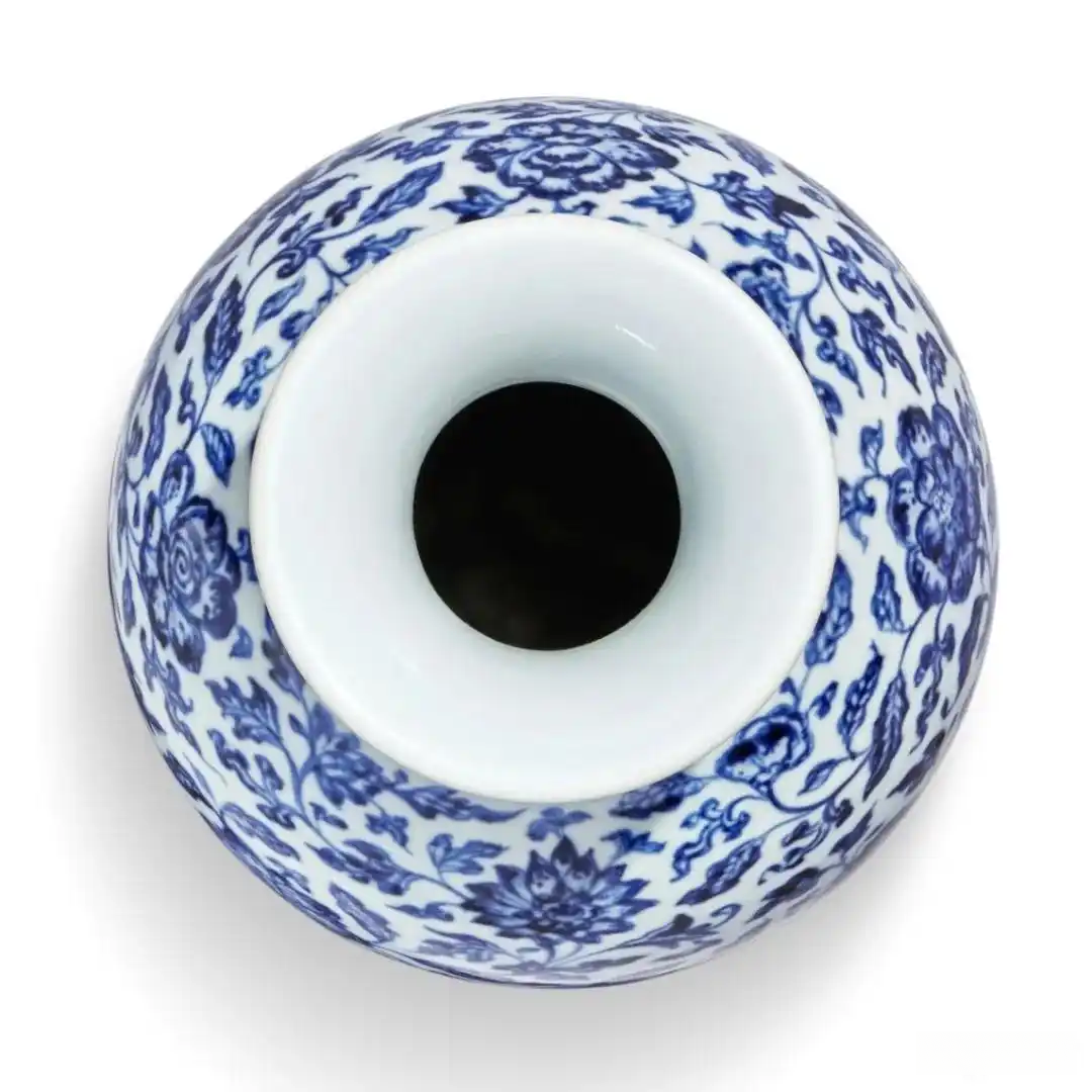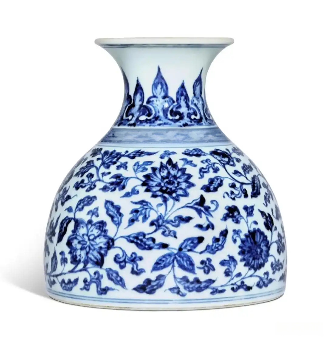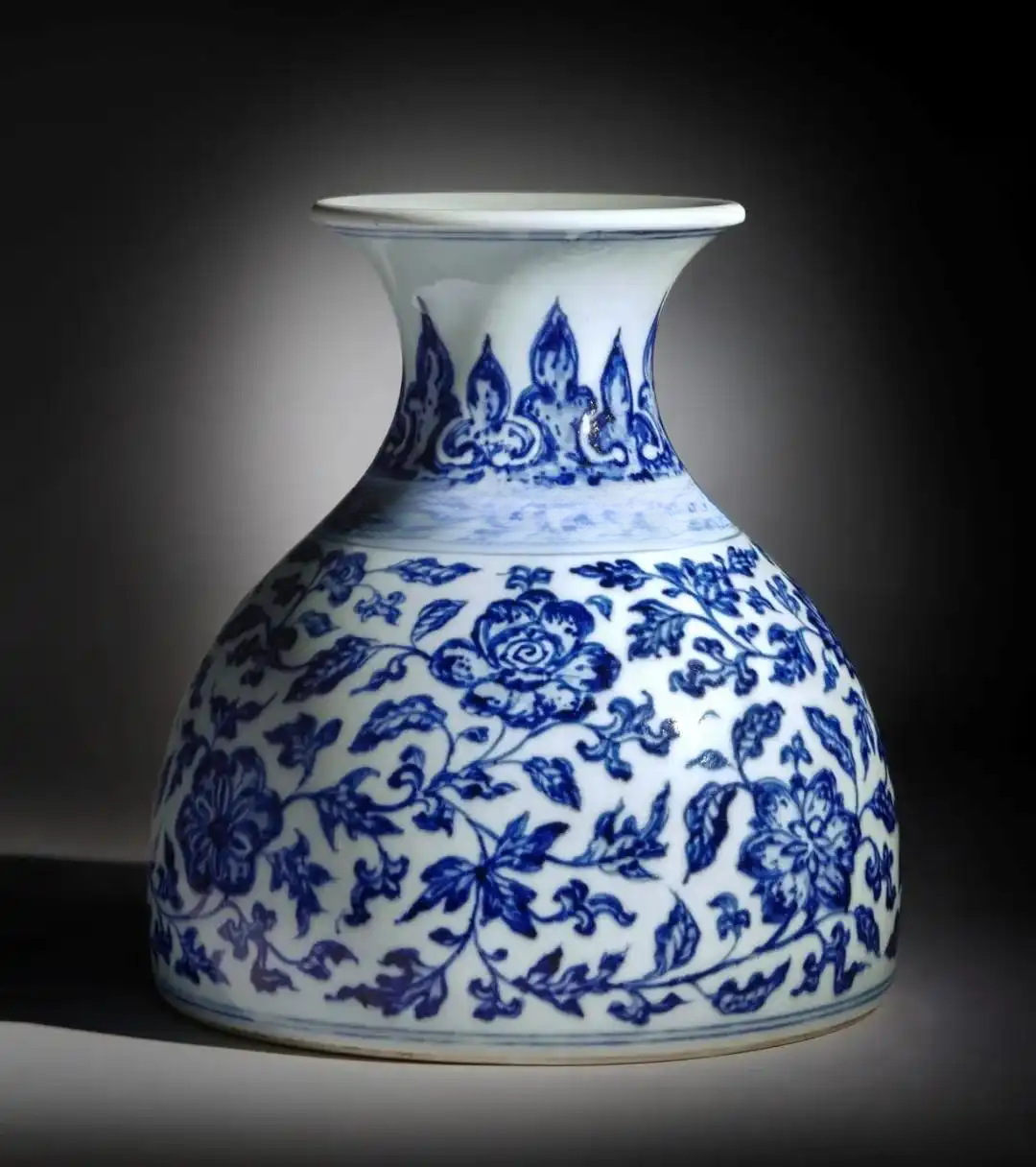 景德镇发展的青花风格,自蒙元以来转变甚为显著。早期浓密而略显压迫、带有外来风格之画法;至永宣时期则转化为典雅的中式审美,植物刻划自然生动,构图开阔舒朗。