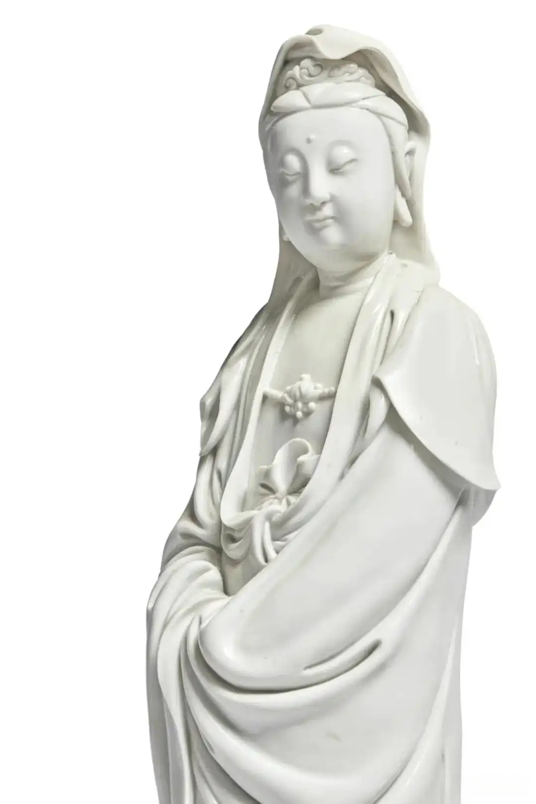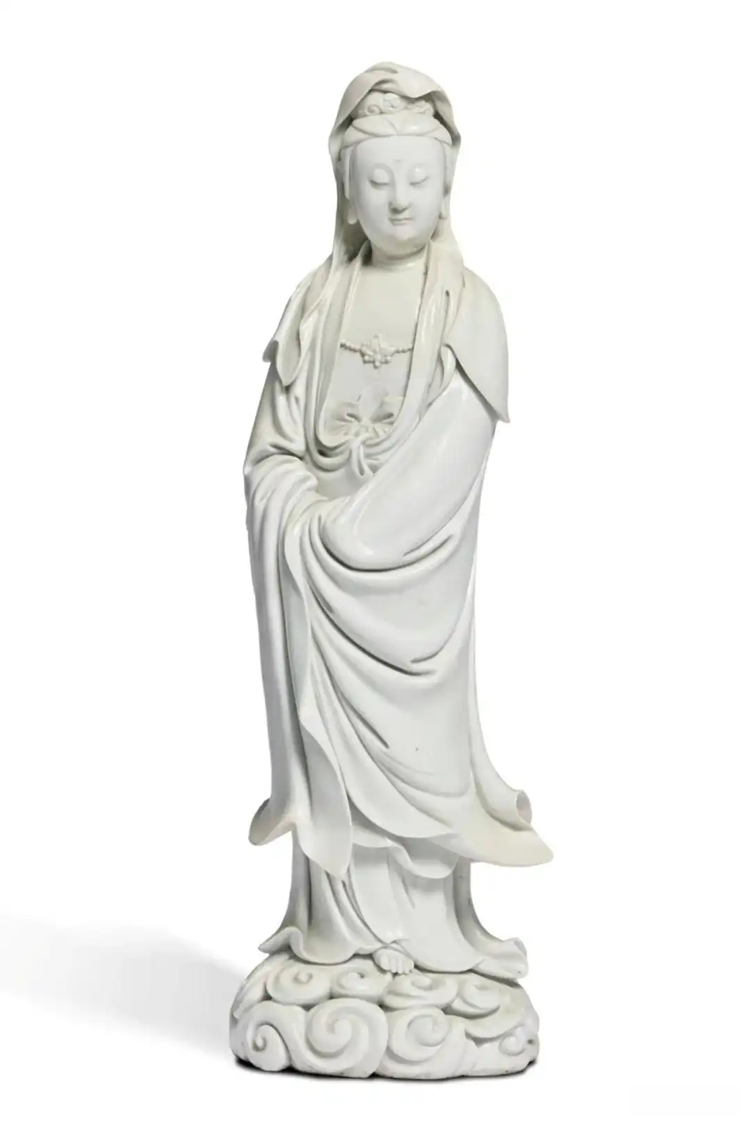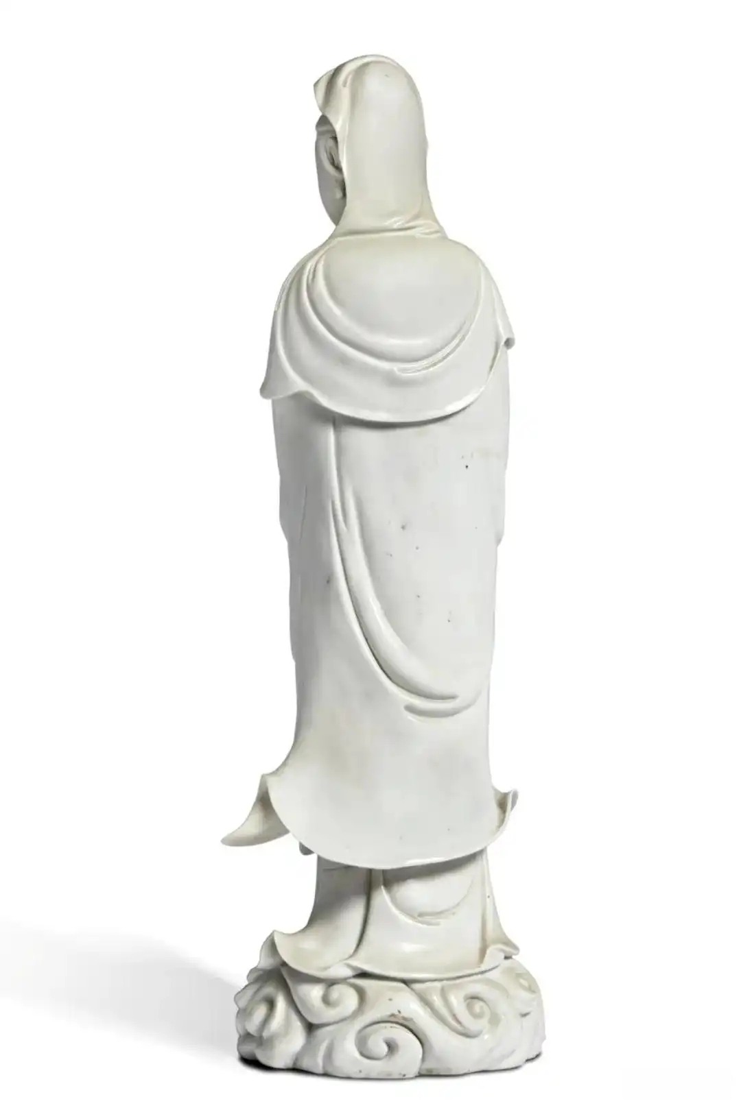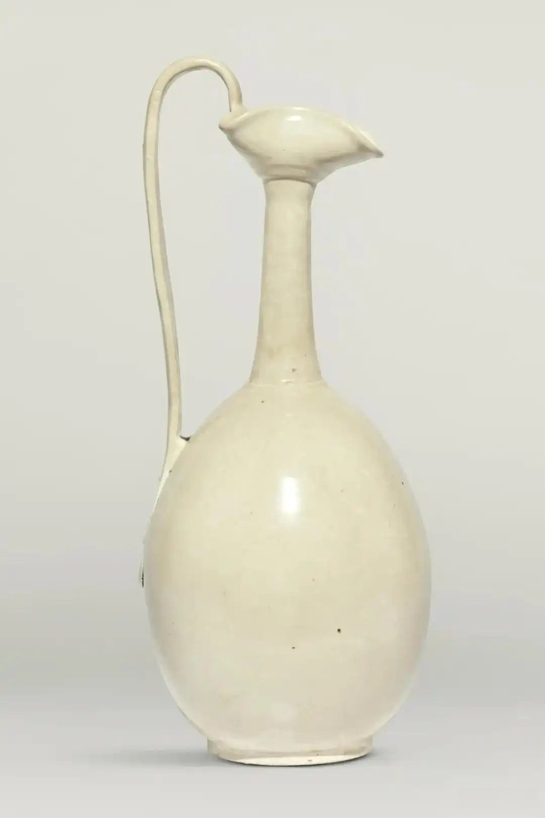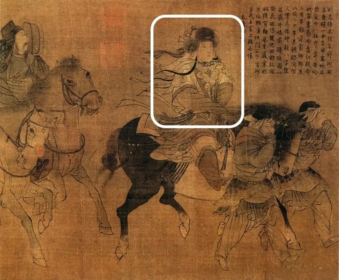 然而,元代瓷器风格尚未完全褪去。以本品为例,肩部如意云头纹相当巨大,便是前朝遗风,或衍生自游牧民族风尚。云头纹用于衣饰之例可见于金代宫廷画家张瑀的《文姬归汉图》,画中文姬身穿番邦服饰,披挂云头状披肩精巧细致,或为织锦。