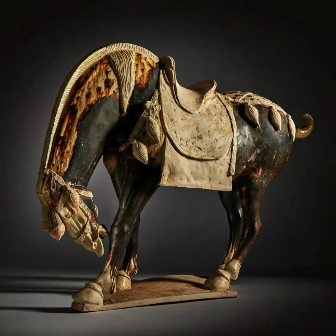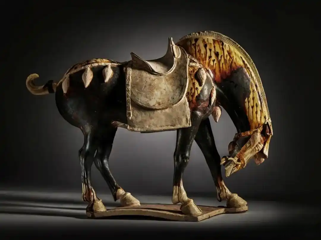 如此釉色处理,大胆写实而节制简约,与原本颜料及鎏金华丽装饰相辅相成。此中痕迹,历经十三世纪仍清晰可辨。鞍褥与流苏施粉红、黑及红色花卉纹,辔具与马鞍则点染鲜绿,尤为夺目者,乃缰绳与配件上之金箔。