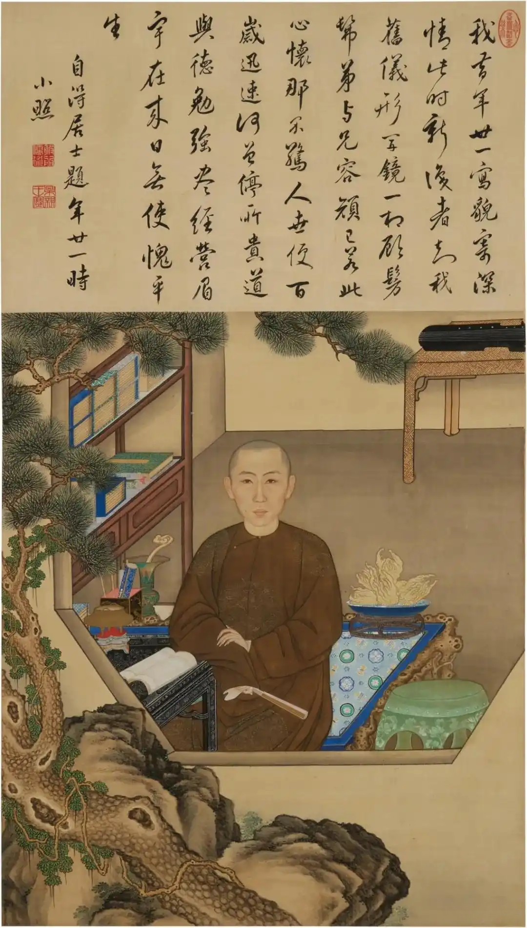 题跋:我昔年廿一,写就寄深情。此时新识者,知我旧仪形。揽镜一相顾,仿佛弟与兄。容颜巳若此,心怀那不惊。人世便百岁,迅速何曾停。所贵道与德,勉强尽经营。眉宇在来日,无使愧平生。