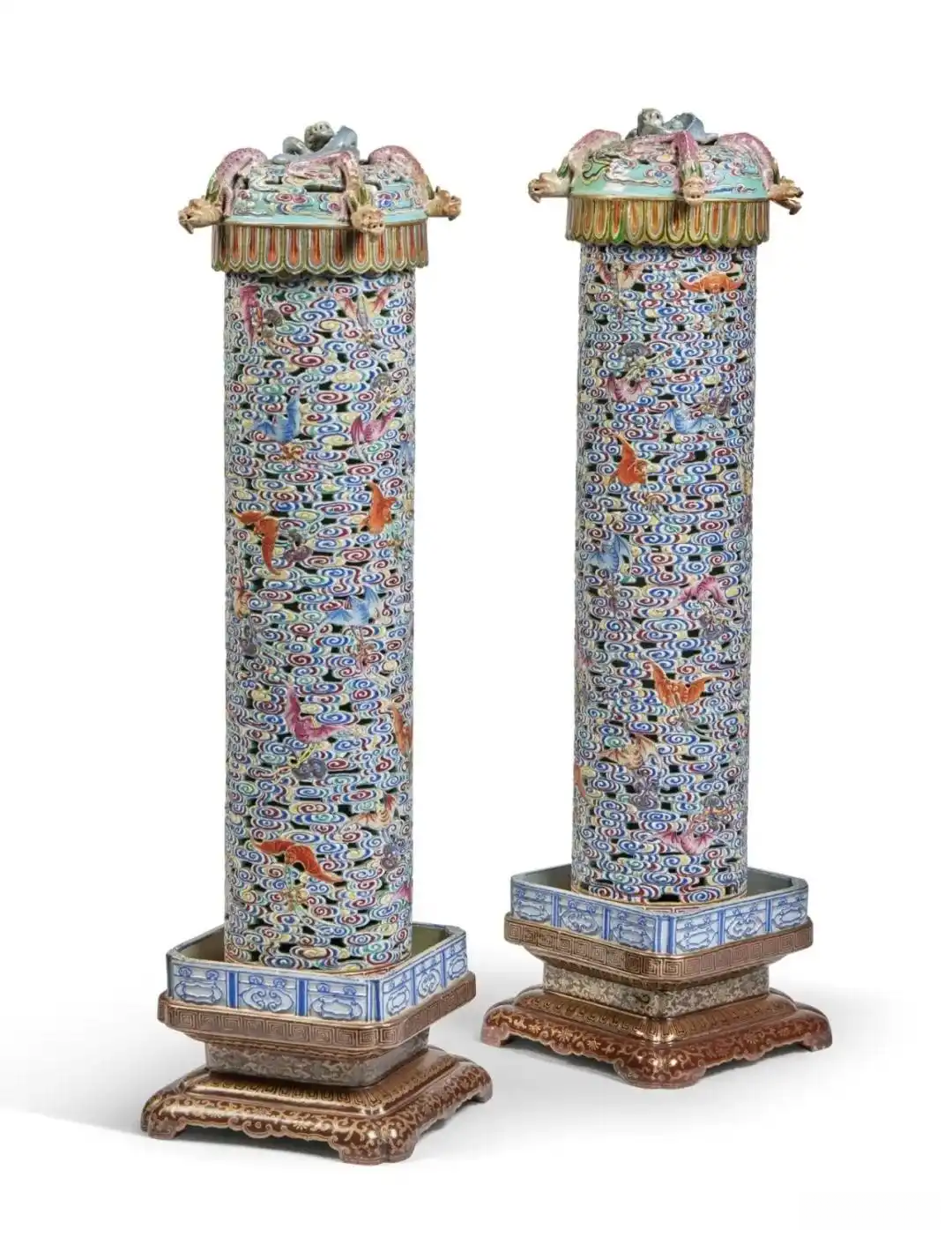 清乾隆 粉彩镂空云蝠纹亭式香熏一对