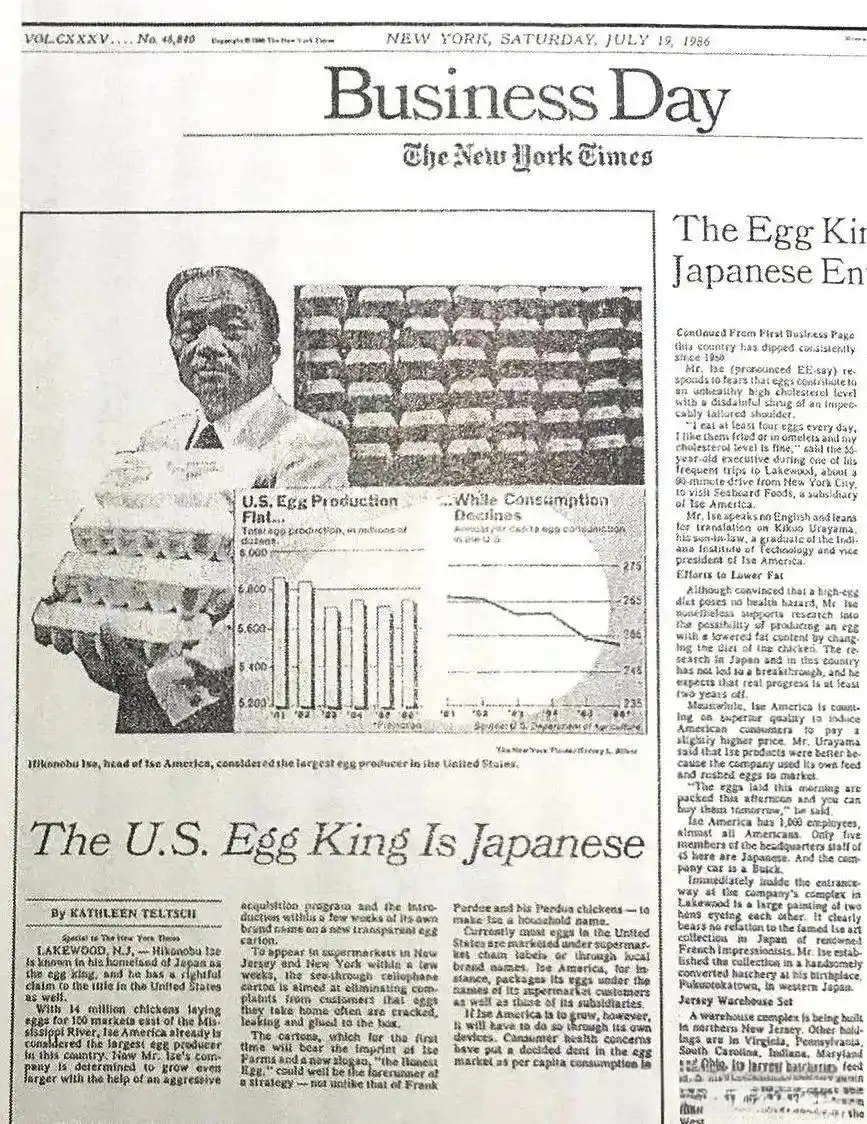 称霸日本后,伊势决定进军当初学师的农业大国 - 美国,于1980年代成立子公司「伊势美国」。 1986年,《纽约时报》以「美国鸡蛋大王是日本人」为标题撰写报道,正好让我们一觑伊势业务规模: