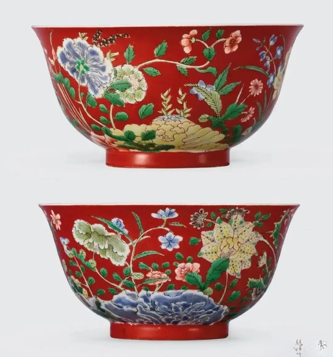 清雍正 珊瑚红地洋彩九秋同庆图碗一对「雍正御制」款|2021年,中国嘉德,RMB 8,510,000成交