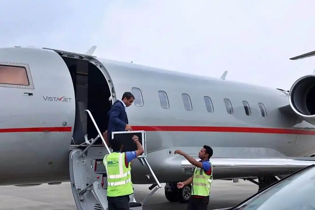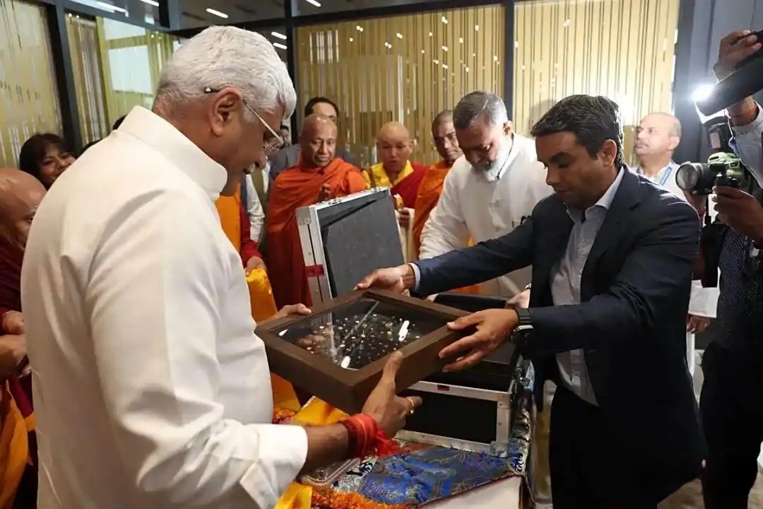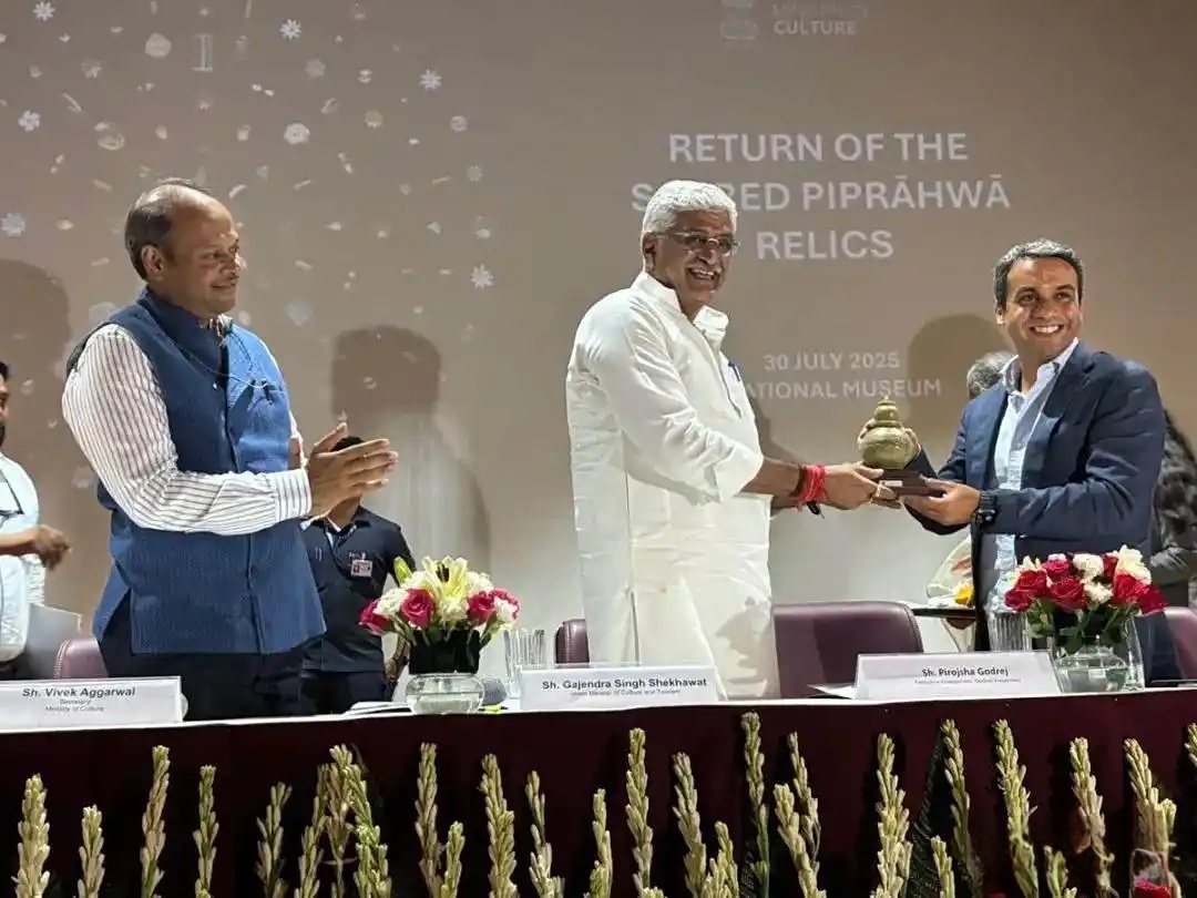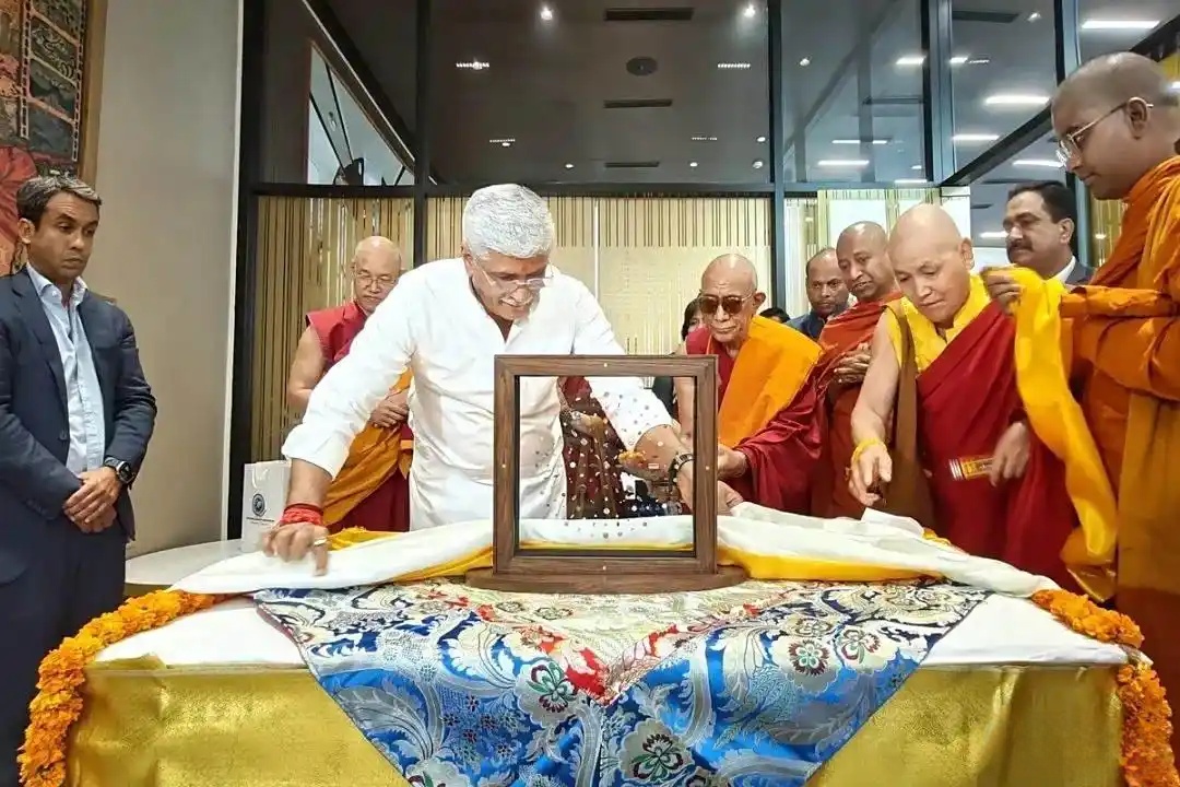 印度政府举办佛教仪式恭迎圣物,白衣者为文化部长谢卡瓦特,左方穿西装的是Godrej家族成员Pirojsha Adi Godrej