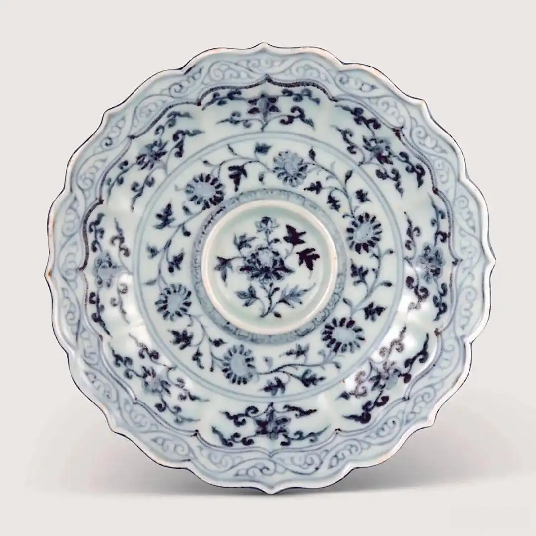 明洪武 青花缠枝花卉纹菱口盏托|2024年,佳士得「区百龄珍藏:首拍」,HK$378万