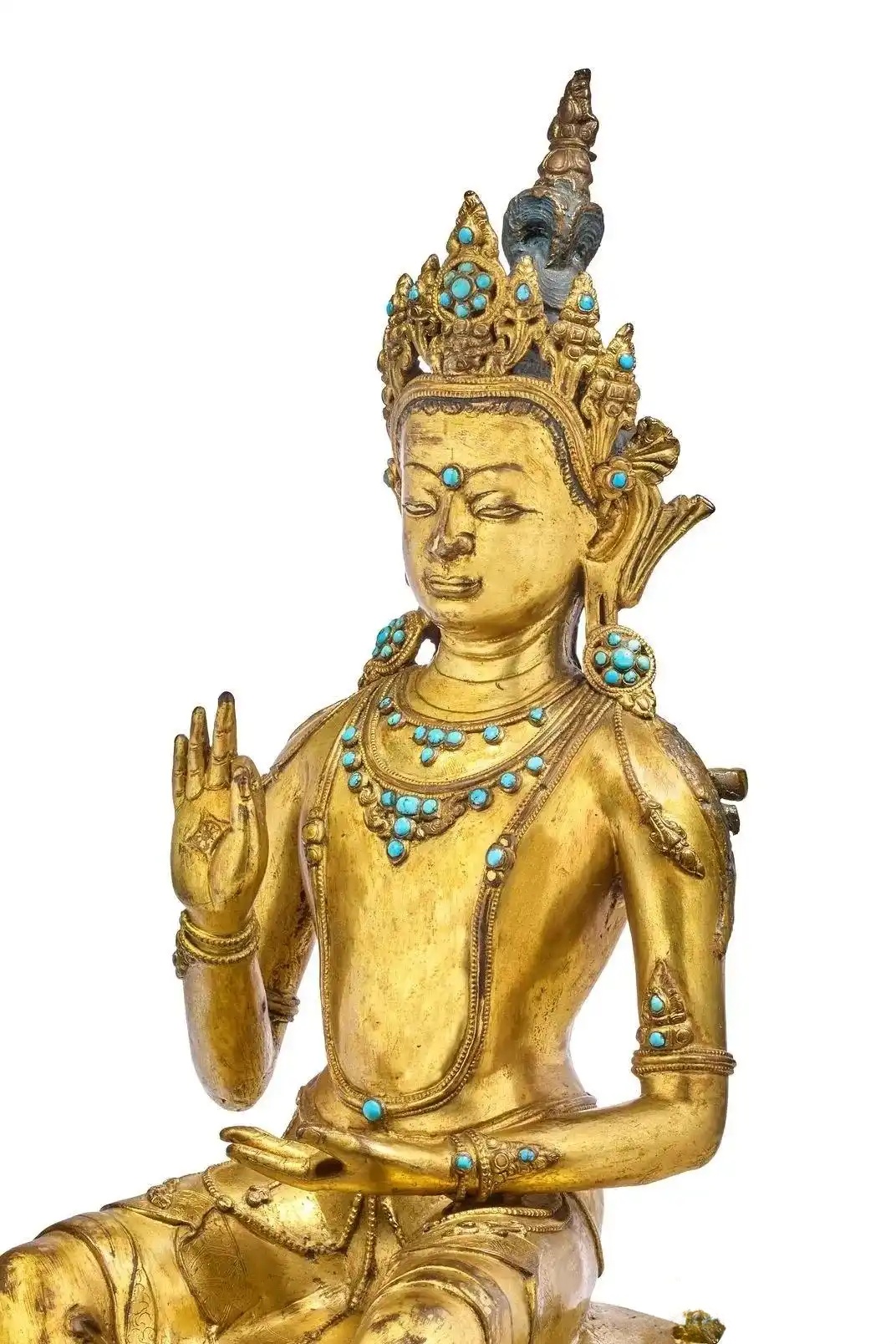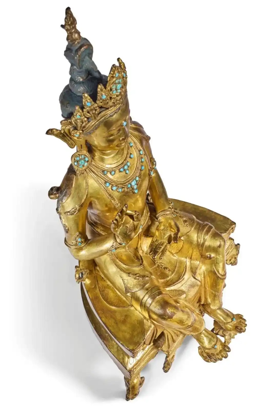 索南坚赞乃藏地一代造像大师,其工坊出品的典型特征包括雕塑装饰、绿松石镶嵌、以及头部柔和发丝。其时,西藏造像风格亦有所改变 - 从轻薄衣着与雄伟躯体,转向更为优雅精致的服饰与面貌。