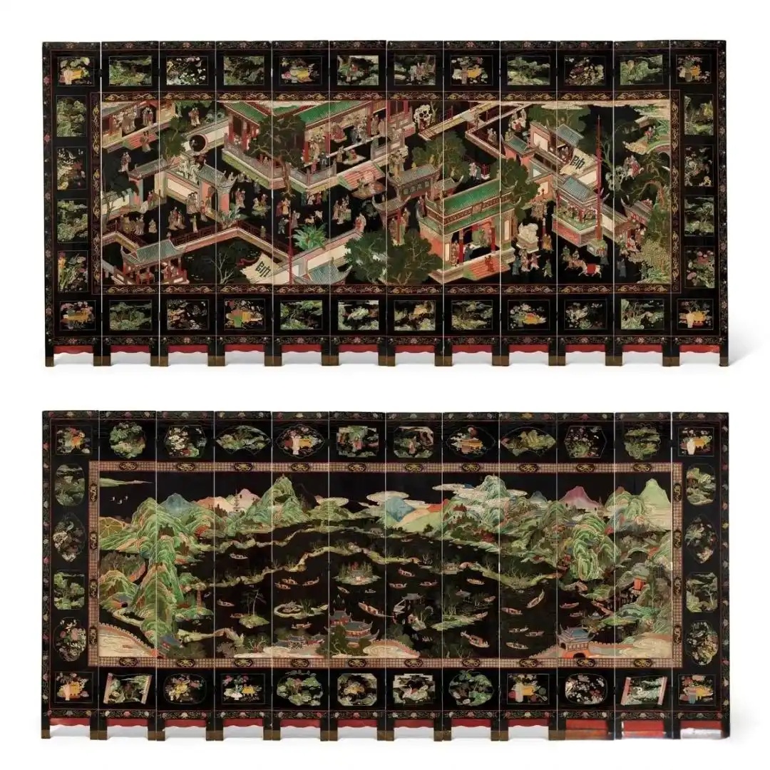 2022年,中国嘉德香港有一近似的十二扇大屏风,同样断代康熙,一面作郭子仪祝寿图,另一面分布山水、花鸟、人物等数十个开光图案,当时以HK$156万成交。