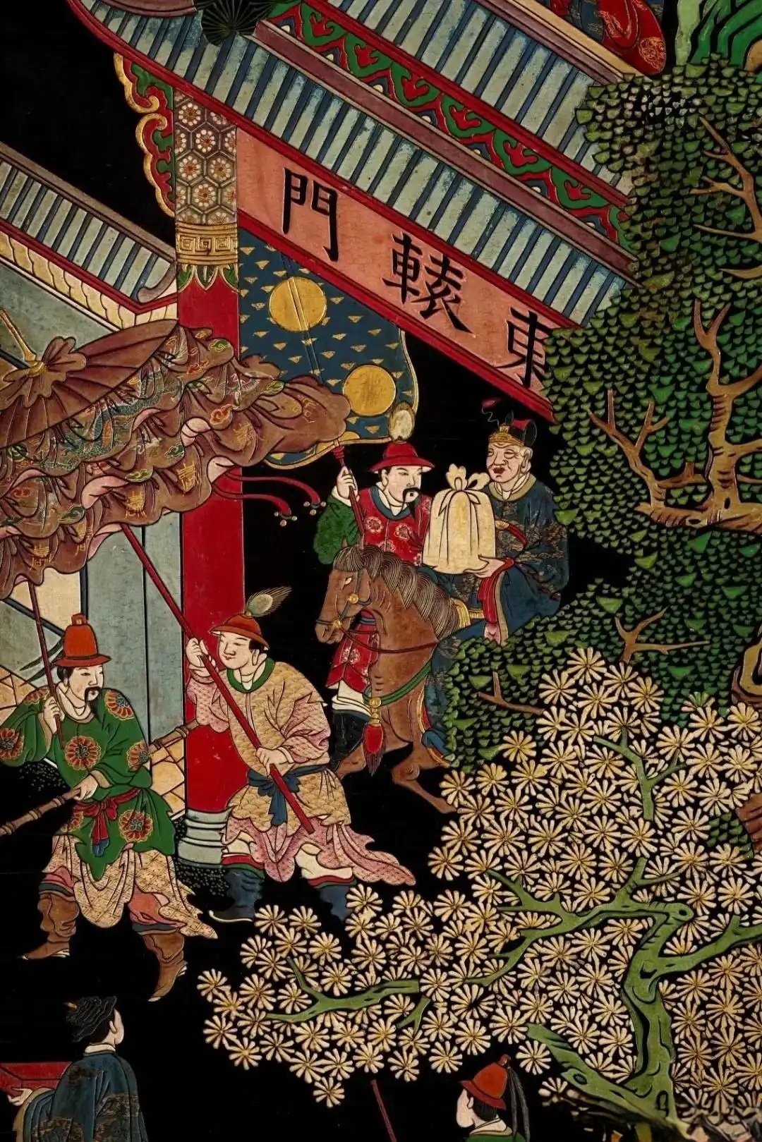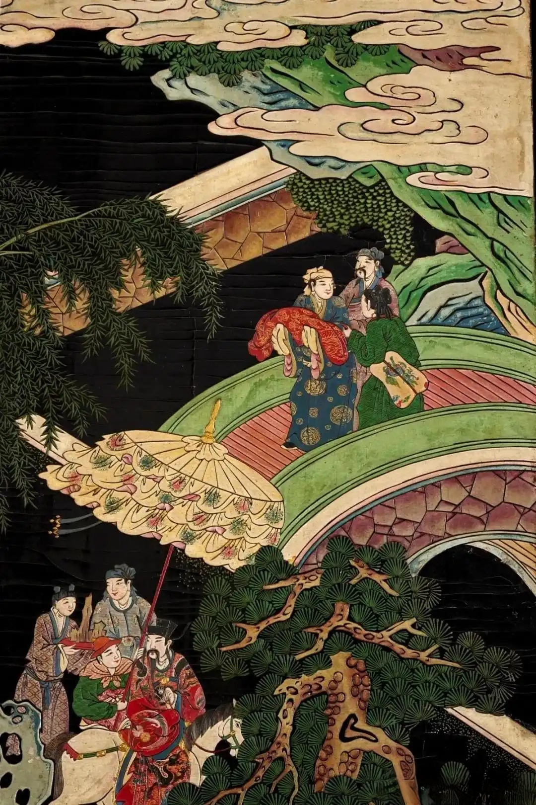 在各色各样的漆艺之中,款彩发展较晚,约十七世纪前后才开始流行,如本品般大量运用于屏风等大型作品之上。款彩藉由南洋贸易而为欧洲认识,称为「Coromandel」,被视为明清漆器代表工艺之一。