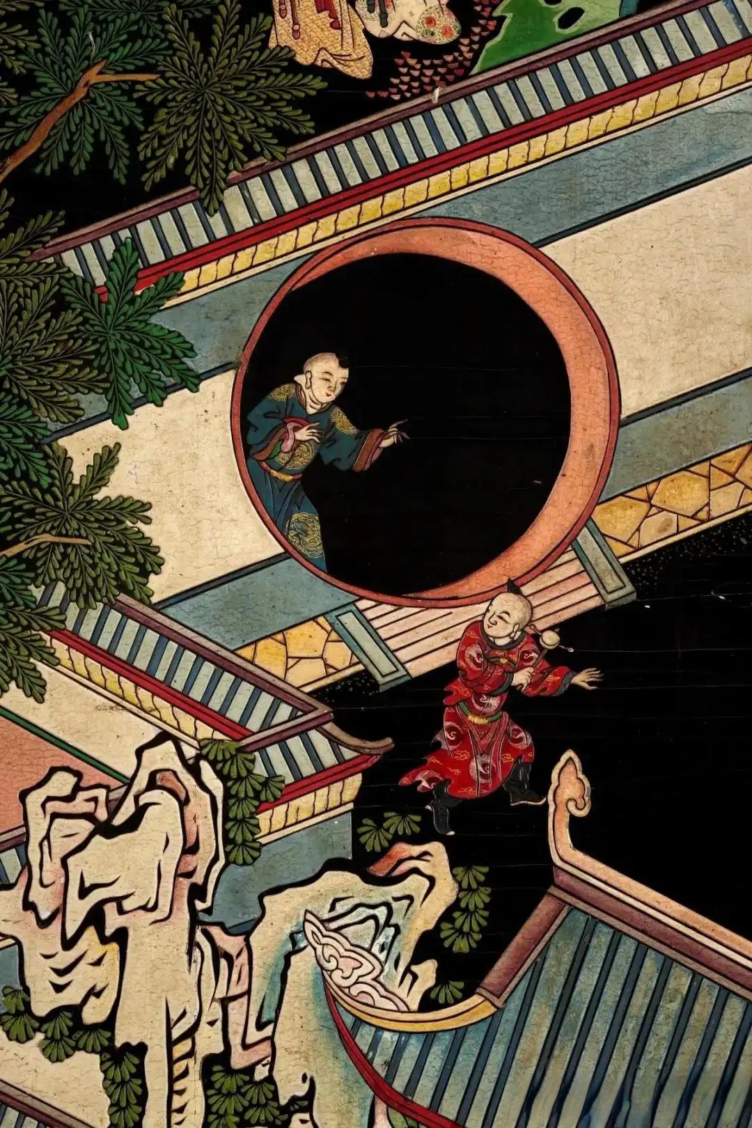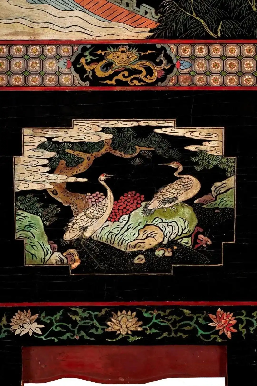 款彩在拍卖世界中不算多见,其实它是漆艺的一种。匠人首先在木板上以生漆(或猪血)和灰打底,在上面刻划花纹轮廓,接着剔去轮廓内的漆灰,再填入红、白、蓝、绿、金等各色彩漆而成。