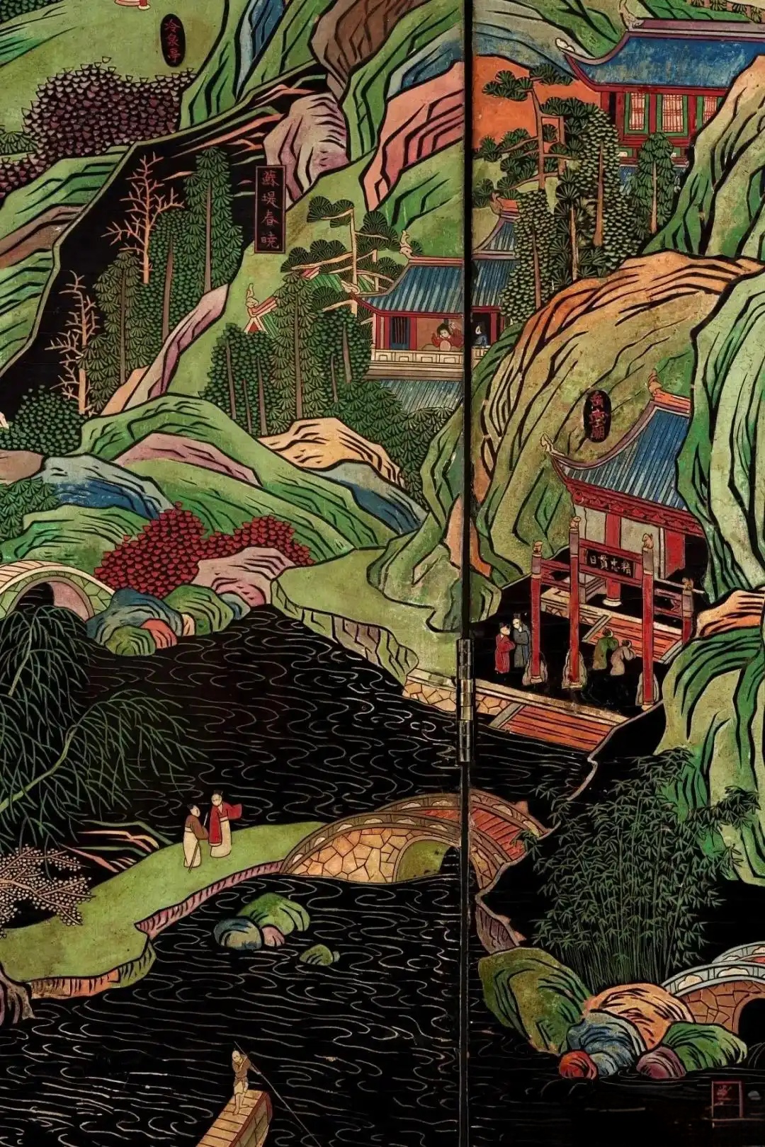 本款彩屏风十二扇,285.5 cm宽,黑漆作底,以山水、花鸟、动物等图案为屏心边框,纹饰精美细腻,制作工艺复杂繁琐。两面主要纹饰各不相同,一面作郭子仪祝寿图,另一面则以西湖十景为饰。