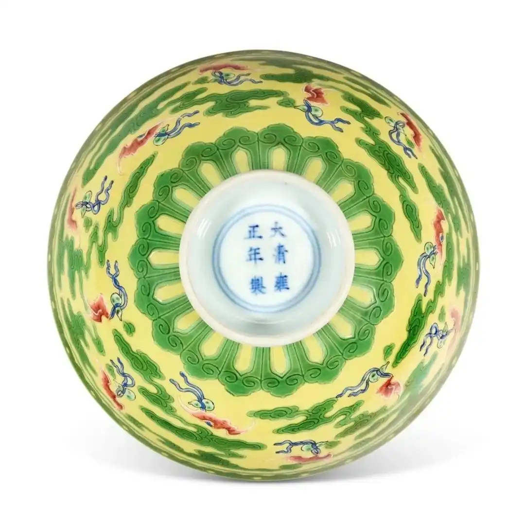 清雍正 黄地绿彩矾红云蝠纹碗