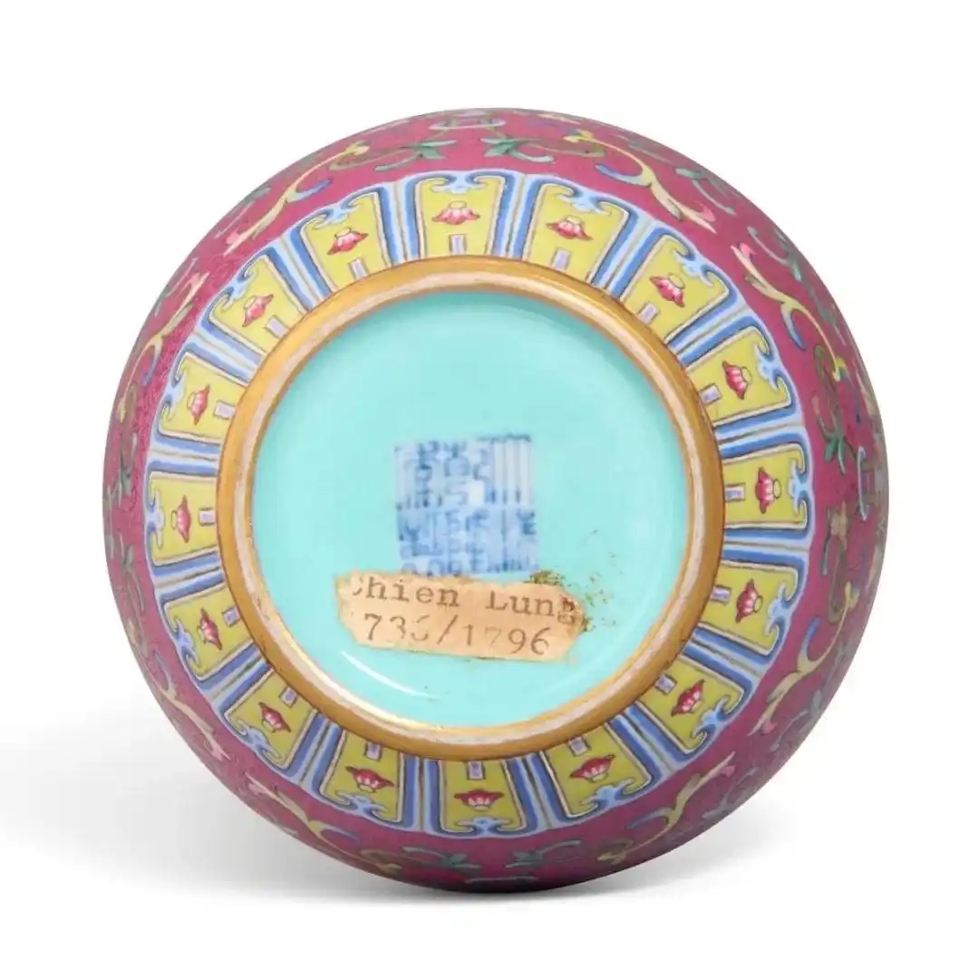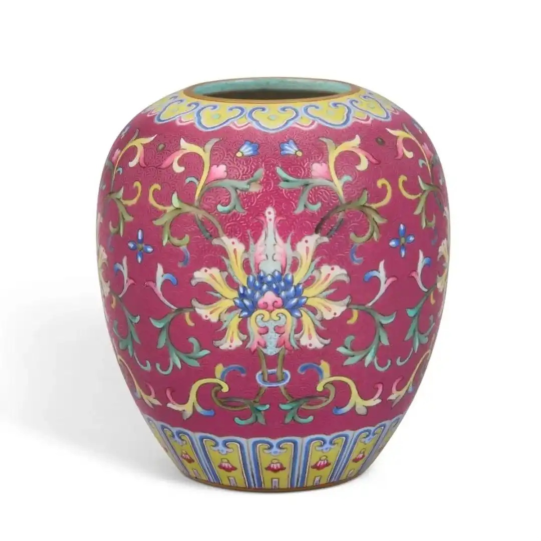 清乾隆 洋彩胭脂红地轧道缠枝莲纹小罐