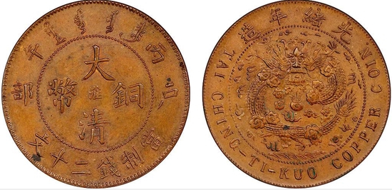 纪录:2018年4月2、5日SBP公司香港“鲍尔斯家族集藏中国铜币”专场拍卖会,目录封底拍卖品第40201号,成交价:50.4万美元,与同场封面拍卖品四川当三十水龙红铜样币并列该场成交价冠军