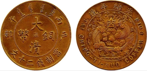 历来我国流通货币只有铸造铜钱一种,无所谓主辅币之分,形成了所谓的“制钱”,既以个数计值又以含铜量为价值标准,故铜价上扬制钱即被私毁牟利造成钱荒。光绪二十六年(1900)粤督李鸿章为解钱荒,仿邻国外洋之辅币开铸铜元,“每百枚换一圆”背英文“ONE CENT”(一分),对银圆作价,此为铜元之始。新式铜币制作精美使用方便,受商民欢迎,官府获利甚丰,因此各省先后仿行。引进西方机器造币后传统方孔制钱也改用机制,这些新造没有秦汉以来中穿方孔的钱币,把“孔方兄”变成了历史名词。